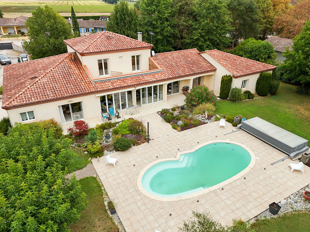 Ce bien se situe dans le Tarn et Garonne A 20 min de Montauban, LAVANDE EN EXCLUSIVITE VILLA 9 PIECES 280 M2 HABITABLES + 32M2 (de terrasse fermée) ET 80 M2 DE GARAGE, SUR TERRAIN DE 4000 M2. TERRAIN : 3953 m2 arboré et paysagé, clôturé, portail automatique de 4m et portillon de 0,90 m avec gâche électrique et visiophone. Arrosage automatique par 44 arroseurs Allée piétonne vers porte d'entrée, allée et parking 8 voitures. PISCINE : Coque de forme haricot de 10m x 4,20m munie de 2 escaliers, et banquette ; profondeur de 1,2 m à 1,70m entourée de terrasse carrelée tout le tour sur 2,20 m de large. Couverture de piscine automatique par panneaux polycarbonate et chassis profils aluminium (chauffage solaire). Douche solaire. STUDIO : De 30m2 avec portes fenêtres, une donnant sur terrasse fermée et l'autre sur terrasse piscine, cuisine aménagée (évier, lave vaisselle, four, plaque vitro, hotte aspirante), salle d'eau (douche, WC, vasque sur meuble) Home cinéma 5 .1 GARAGE : De 80m2 et 3,30 sous plafond, carrelé, isolé et peint ; porte séquentielle motorisée de 5mx 2,15m et porte de 0 ,90m, 2 fenêtres avec volets électriques. Capacité 3 véhicules Chaudière, évier. HABITATION : Construction sur vide sanitaire accessible (0,65 cm de haut) y compris sous terrasse. Entièrement carrelée RDC et étage Chauffage basse température par le sol et régulation automatique. Eau chaude par ballons électriques (1de 300l et 3 de 150l) Fermeture par 18 volets roulants électrique commande individuelle, centralisée et horloge. Alarme par radars et transfert d'appels vers téléphone portable. Antenne TNT (prise dans chaque pièce) et parabole satellite (prises séjour et studio) Ventilation centralisée (3 caissons en grenier) RDC : Séjour de 63 m2 avec 4 portes fenêtres de 2,40 m et 2 de 0,90 m (2,70 m sous plafond) Cheminée bois, home cinéma (7 ,1) prise tv TNT et SAT Terrasse de32 m2 couverte carrelée et fermée par baies vitrées à ouverture par repliage accordéon, et 1 porte donnant accès aux arcades séjour. 2 stores bannes extérieurs de 5mx 3m Cuisine de 16 m2 aménagée (four, frigo, plaque induction, micro ondes, lave vaisselle, hotte aspirante, évier deux bacs) porte-fenêtre galandage accédant à la terrasse couverte. Cellier de 12m2 avec évier et placard (3m) 2 Chambres parentales RDC de 20m2 avec salle d'eau ( douche à l'italienne de 1,70m x 0,80 m avec siège, WC , mobilier et vasque ) placards et dressing (7m2 ) climatisations . WC avec lave-mains Bureau de 9,5m2 avec porte-fenêtre Hall d'entrée et couloir de 15m2 avec escalier marbre accédant à L'étage, porte d'entrée vitrée de 1,30m x 2,15m ETAGE : 3 Chambres , deux au sud de 15m2 avec placards et porte-fenêtre donnant sur terrasse solarium de 25m2 ; une au nord de 12m2 avec placard ; 1 sdb de 4,5m2 ,1 salle d'eau de 3m2 et 1 WC indépendant. Dégagement de 6m2 en haut de l'escalier, avec placard. LES PLUS: Arrosage integré avec zones Forage de 90m Chauffage au sol Cheminée Portail automatique Fibre Magnifique terrain arboré Aucun vis à vis Alarme Piscine avec couverture Bien d'une qualité rare situé dans un environnement privilégié. Chers confrères je suis ouverte à l'inter agence. Annonce rédigée sous la responsabilité de Cynthiana Steinbach agissant sous le statut de directrice d'agence immatriculé RSAC MONTAUBAN 909 138 042 Agent immobilier auprès de la SARL VENDS LE BIEN - Carte professionnelle T et G n° CPI 8200 006 CCI de Montauban(82) ; Garantie par MMA IARD- GALIAN Le professionnel garantit et sécurise votre projet immobilier ! Les honoraires sont à la charge du vendeurEtat général : Excellent