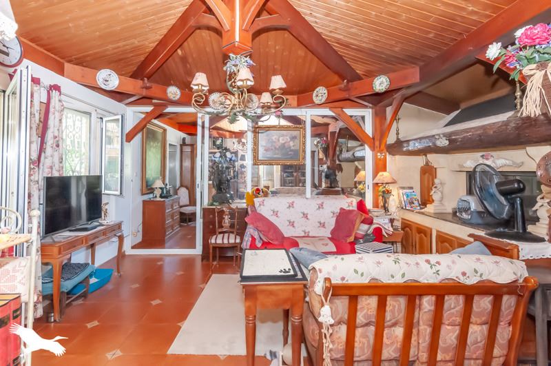 La maison possède une véranda avec cheminée et climatisation, un séjour avec poutre apparentes et deux belles chambres.