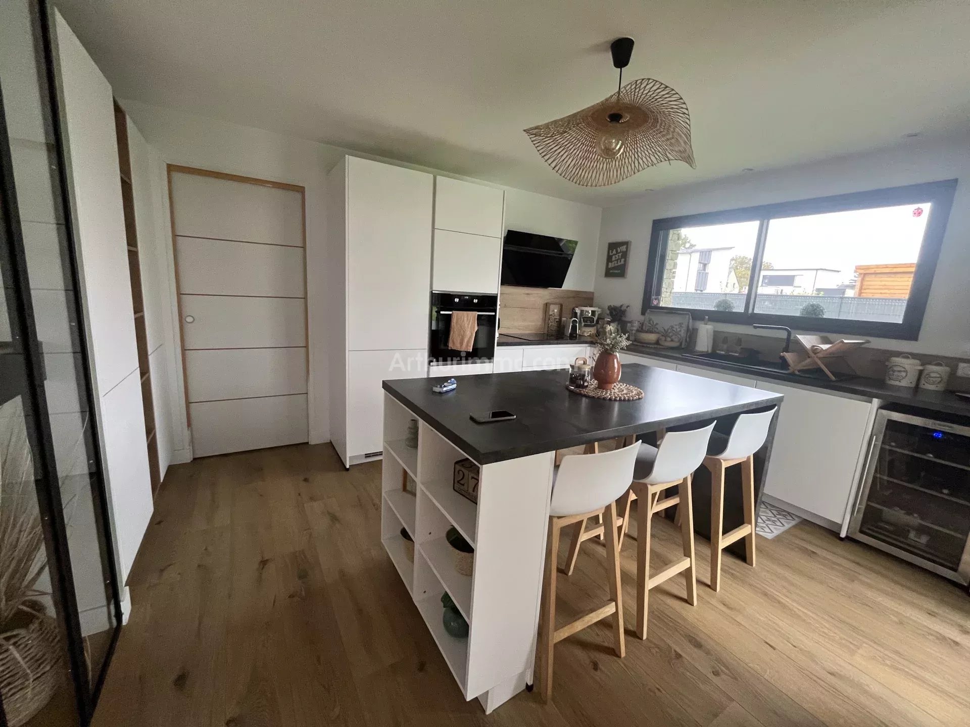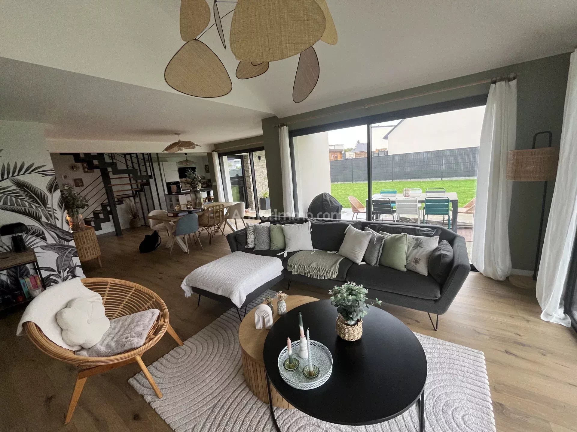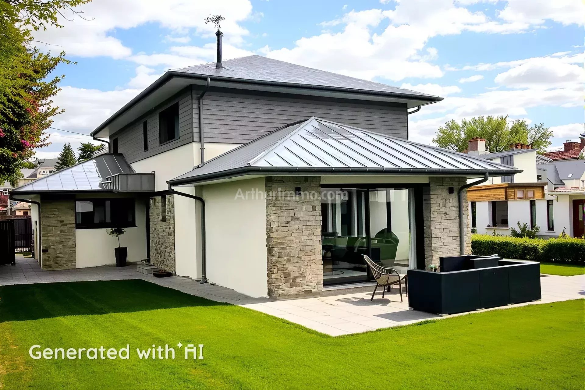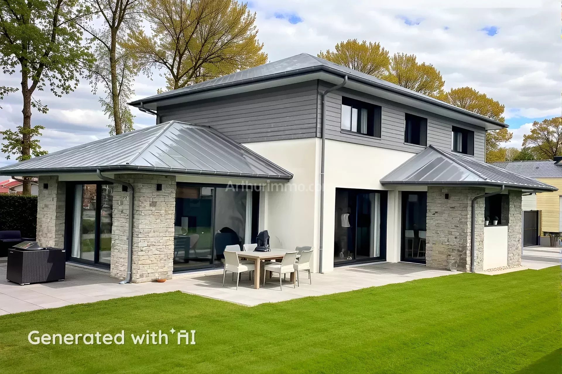 Très belles prestations pour cette maison contemporaine de 2021 avec sa toiture en zinc à plusieurs pans, son parement de pierres et son bardage bois.