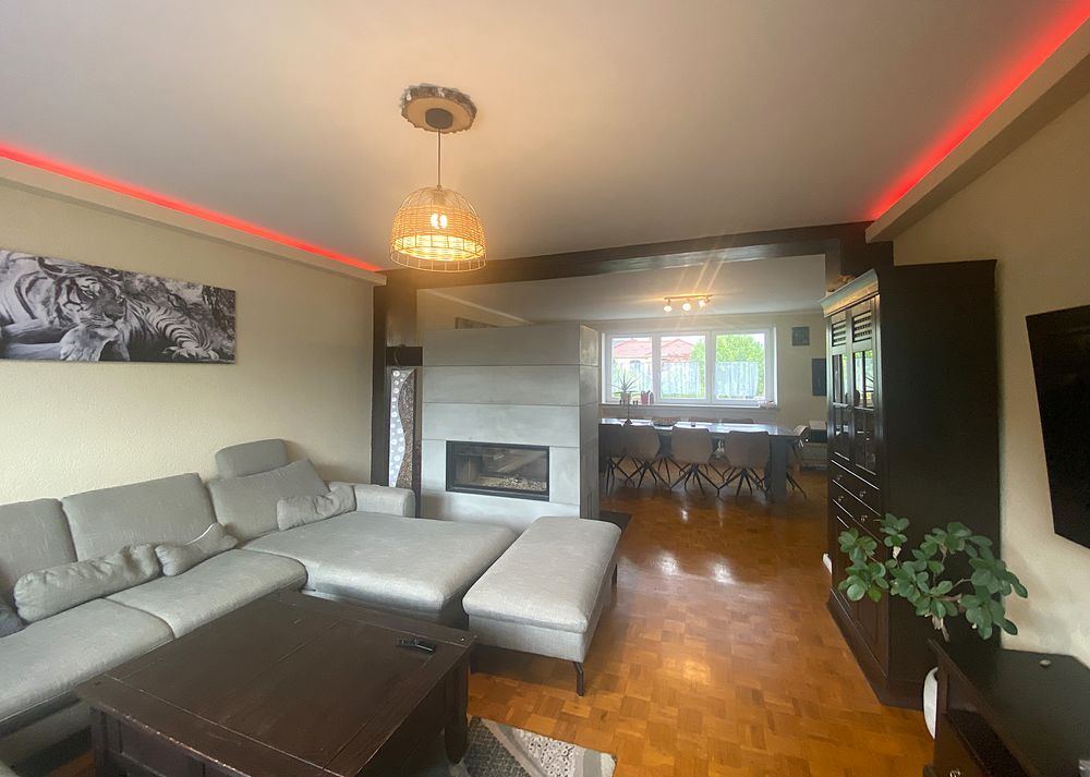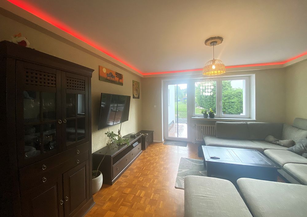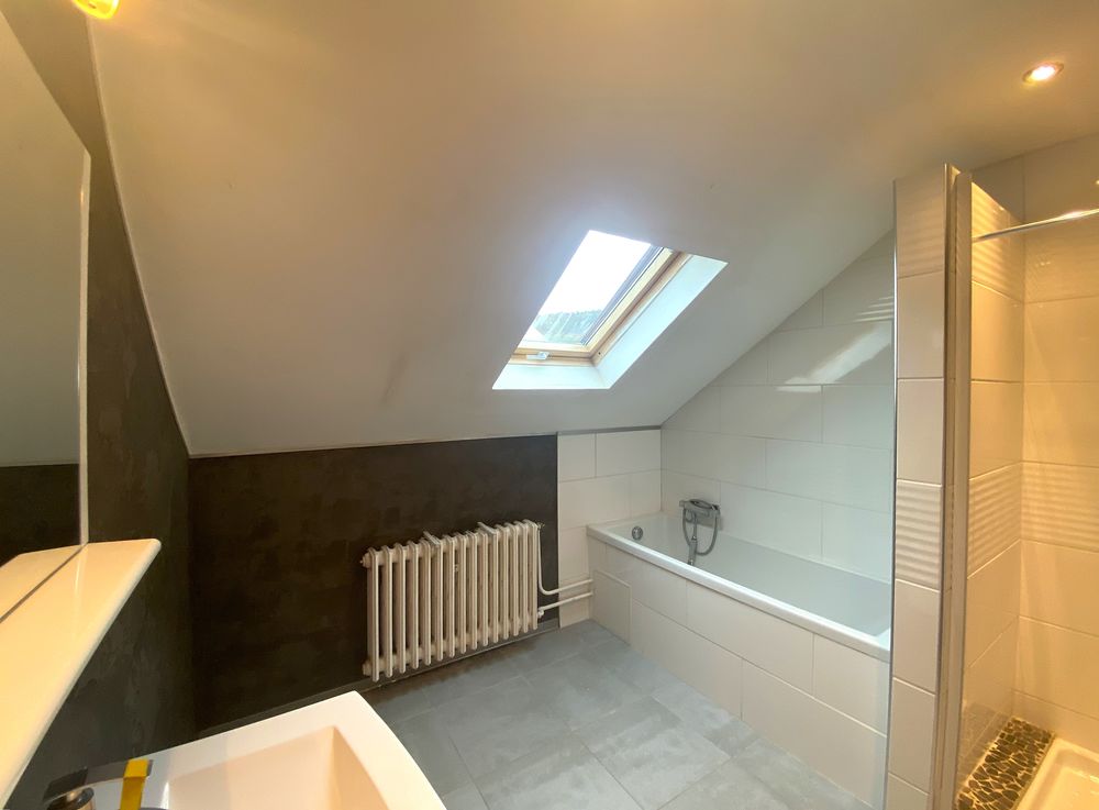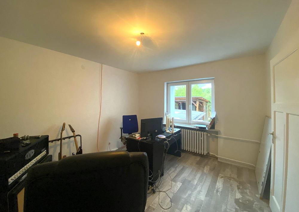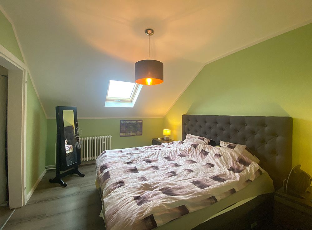 Depuis l'entrée, vous accédez à un séjour lumineux avec coin repas, cheminée et accès à la terrasse avec jardin. Vous y trouverez également une grande cuisine, deux autres pièces (dont une pièce de passage avec débarras), ainsi qu'une salle de bain équipée d'une douche, d'une baignoire, d'un lavabo, d'un WC et d'un raccordement pour machine à laver.