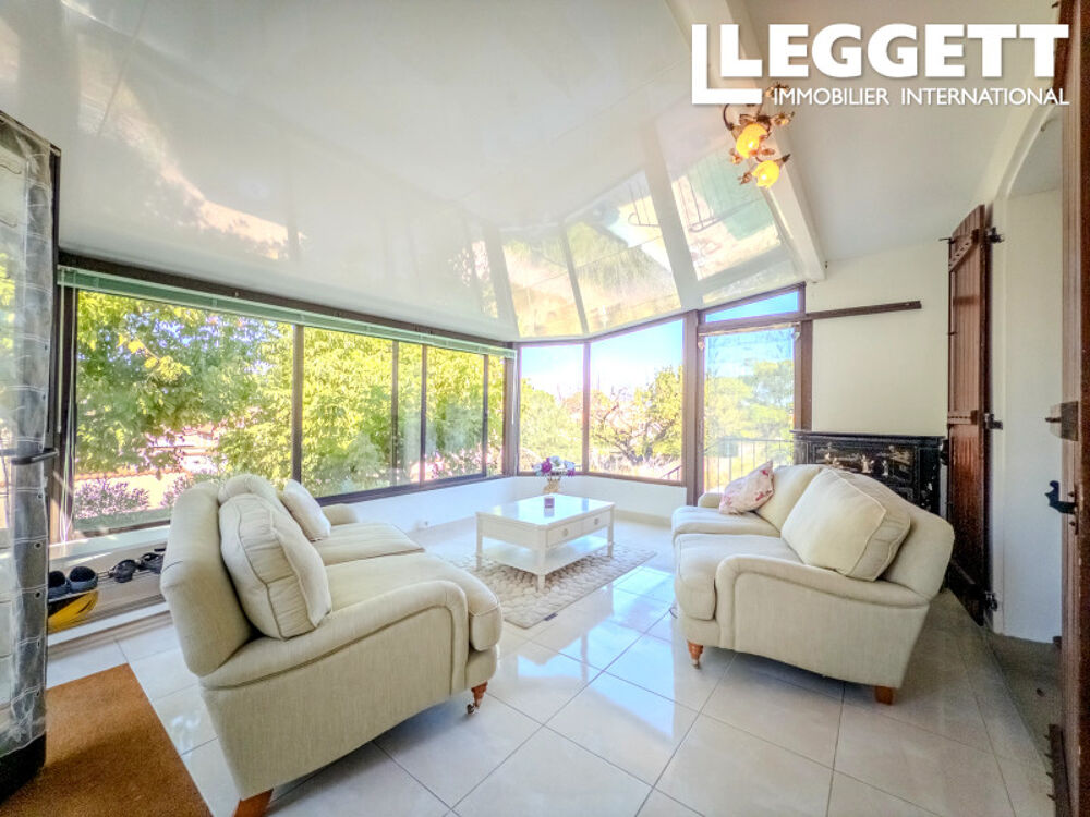 Vous entrez par une véranda vitrée donnant immédiatement sur le jardin et la piscine.