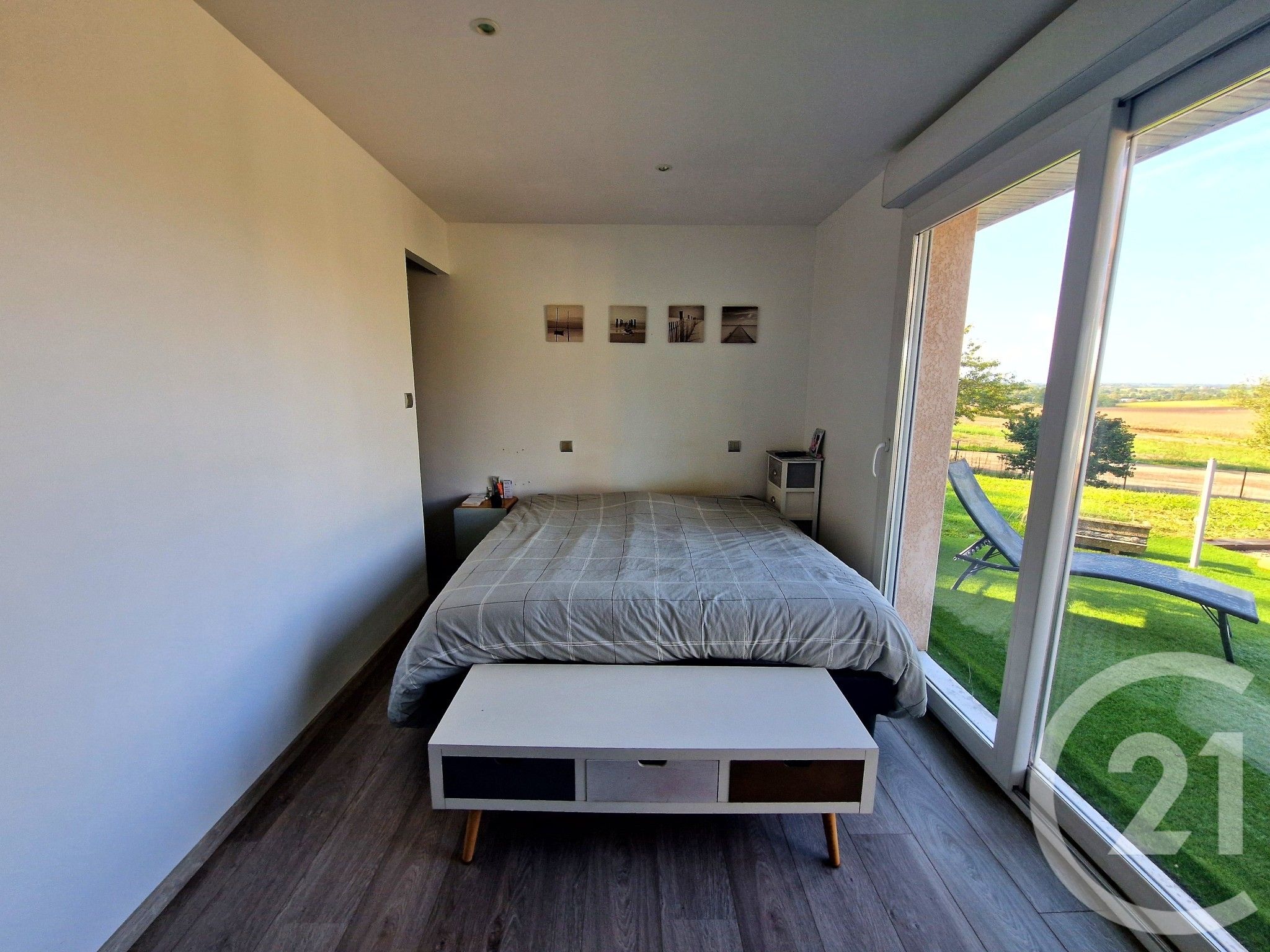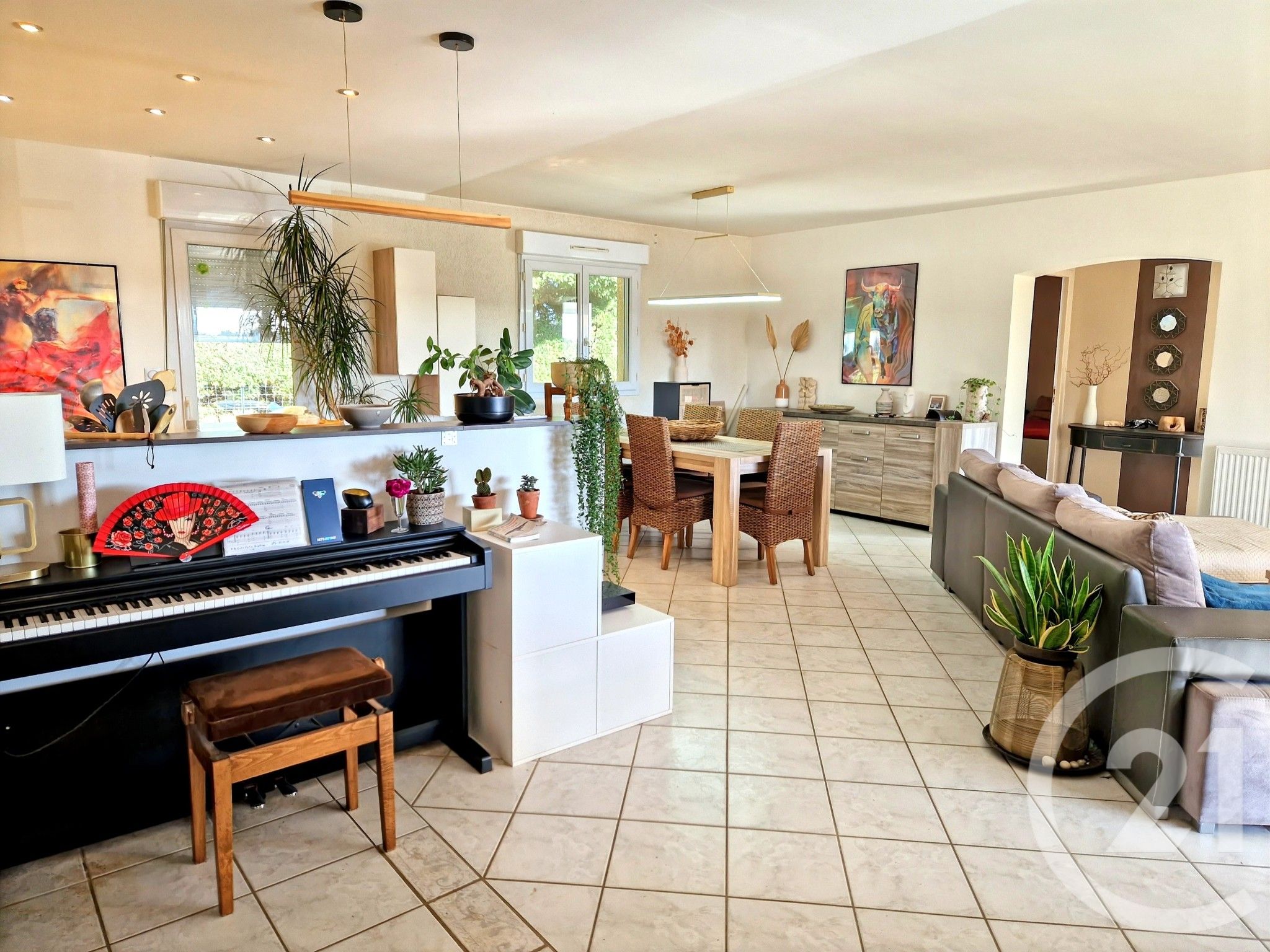 La pièce de vie, spacieuse et lumineuse, est ouverte sur une cuisine aménagée et équipée, récemment installée.
