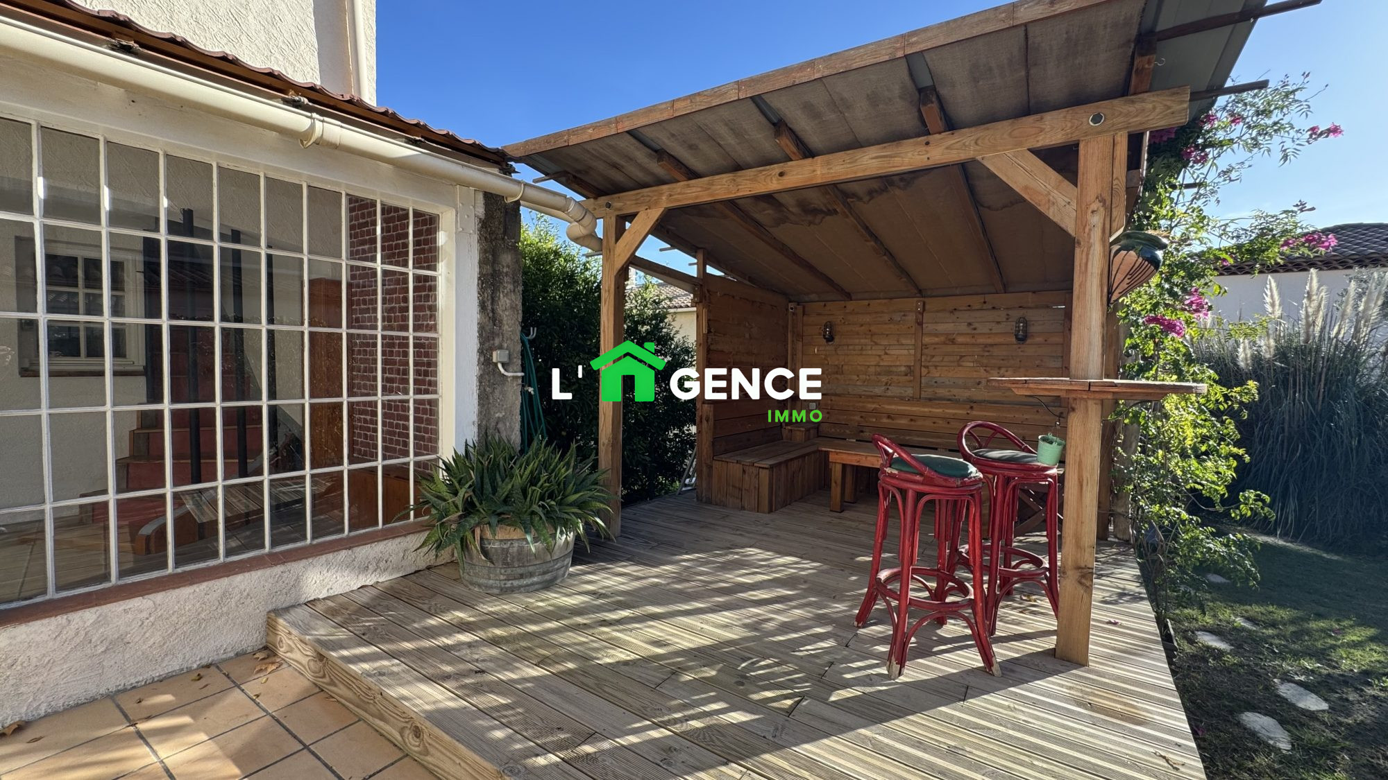 La véranda lumineuse prolonge agréablement l'espace de vie et s'ouvre sur un jardin intimiste, idéal pour les moments de détente.