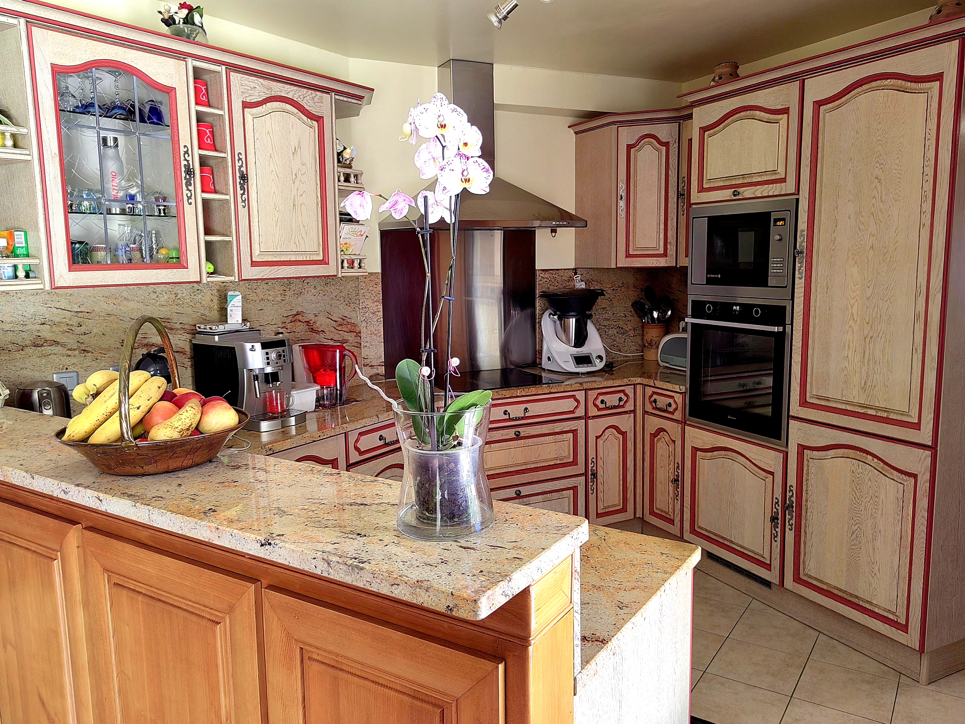 Celle ci se compose en rez-de-chaussée d'une entrée avec grand placard penderie, un spacieux salon/séjour avec cheminée insert, la cuisine équipée et aménagée est ouverte sur le salon/séjour, une pièce véranda pourrait devenir une chambre, une suite parentale avec accès terrasse, sa salle de bains balnéo et douche, double vasque et toilettes, des toilettes séparées avec lave mains, un cellier/ buanderie.