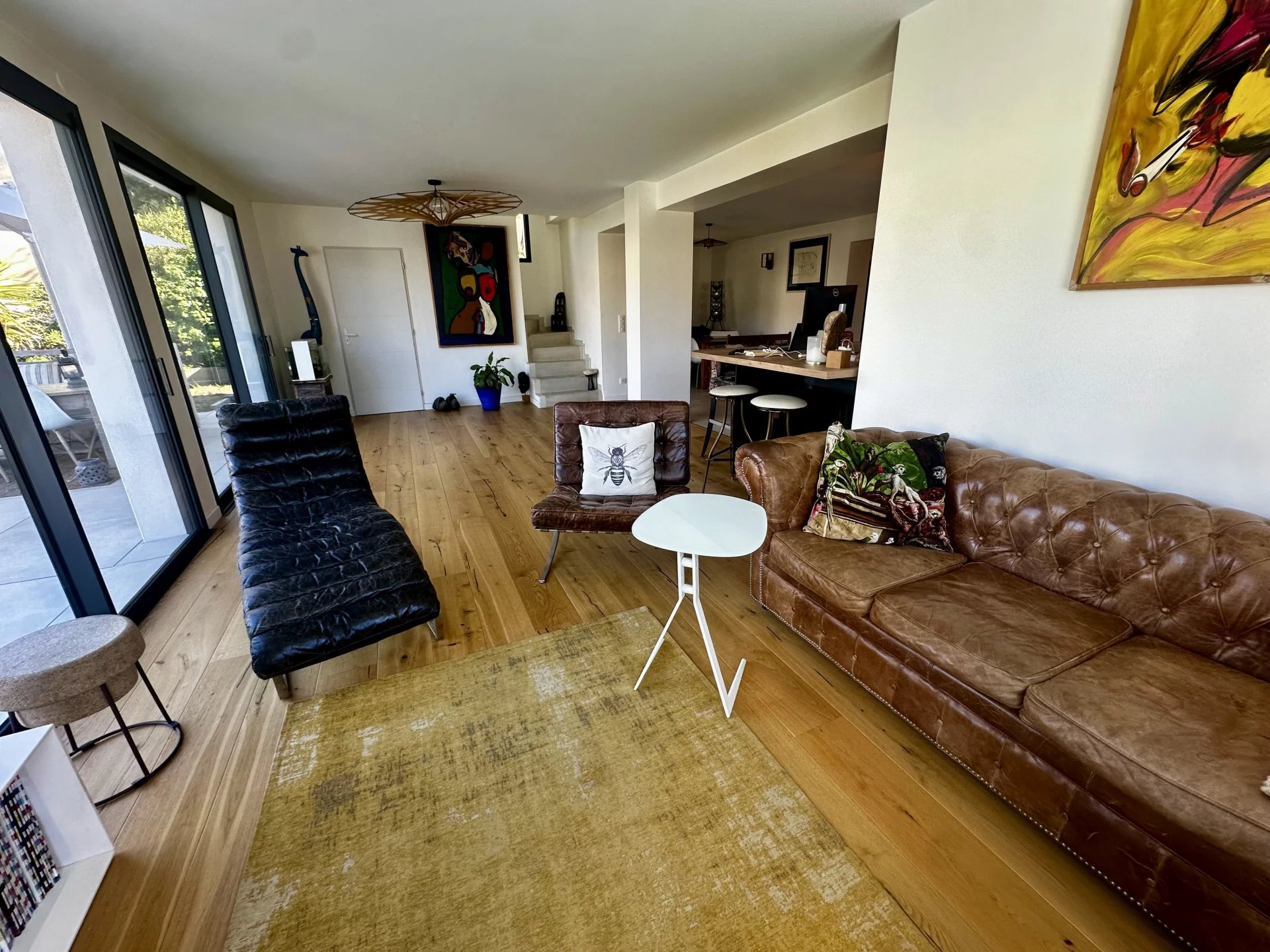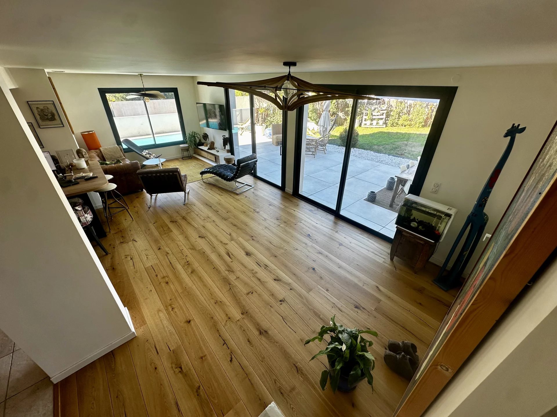 Vaste pièce de vie traversante ouvrant directement sur le jardin et l'espace piscine
