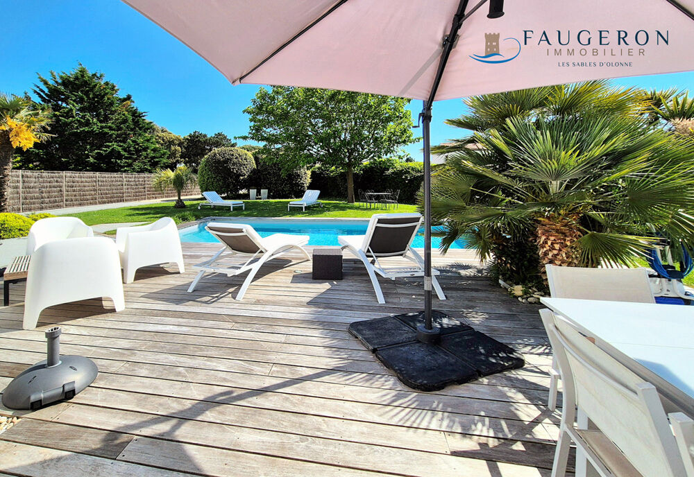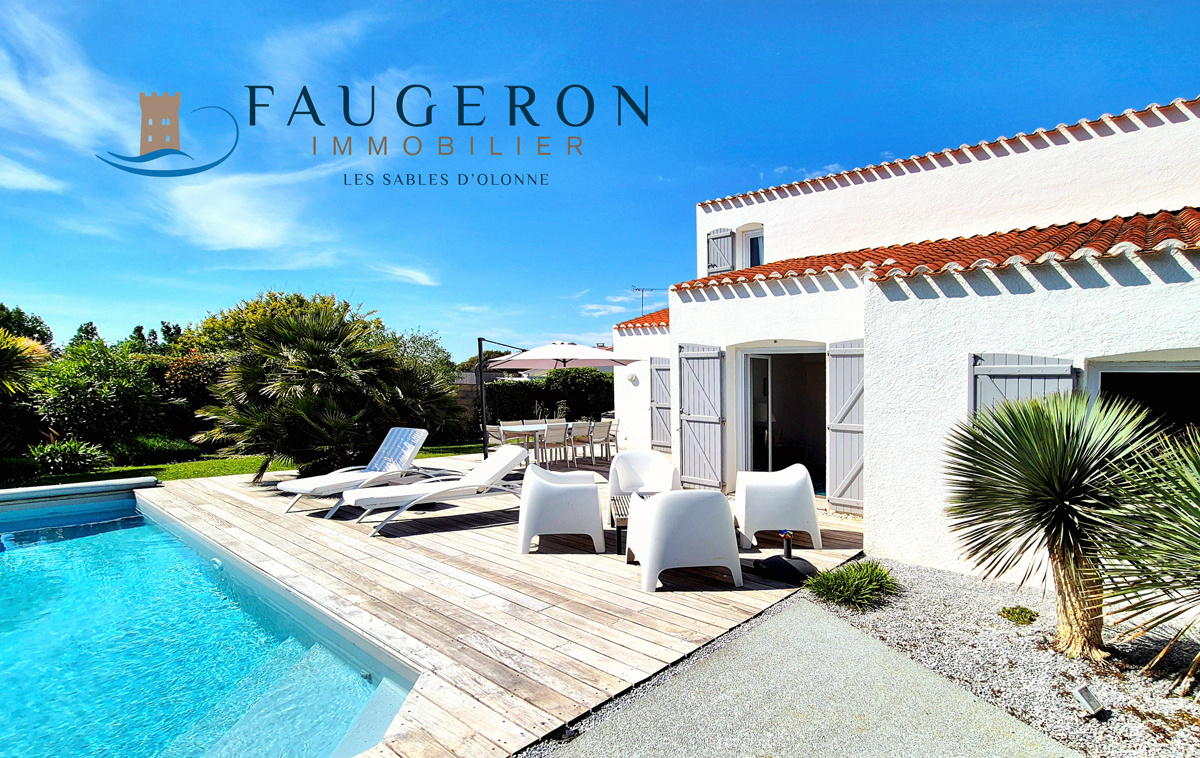 Proche du Golf de Bourgenay et de la pinède - Villa de 120 m2 hab. parfaitement entretenue, confortable et fonctionnelle : salon/séjour avec cheminée, 4 chambres dont 2 en RdC, SdB & SdE, terrasses et piscine chauffée à l'abri des regards + grand garage et stationnements sur espaces paysager de plus de 1100 m2. Architecture traditionelle vendéenne de bord de mer, proche des loisirs et commerces
