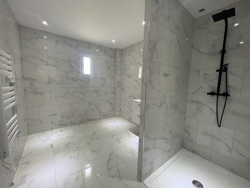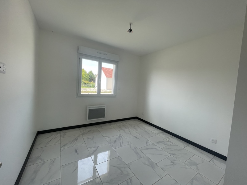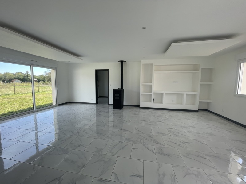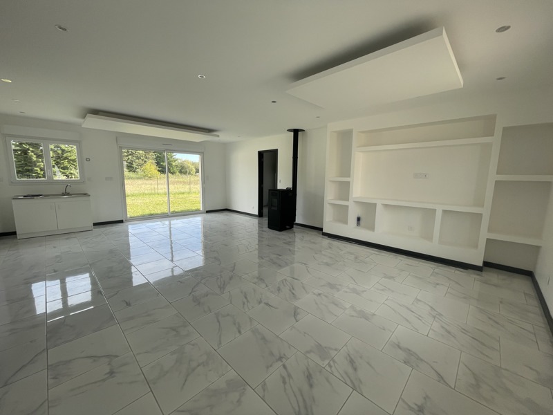 Pavillon moderne de plain-pied comprenant une belle pièce de vie lumineuse avec un poêle à granulés, une buanderie, trois chambres avec emplacement pour placard, une salle d?eau et des WC, ainsi qu?un garage.