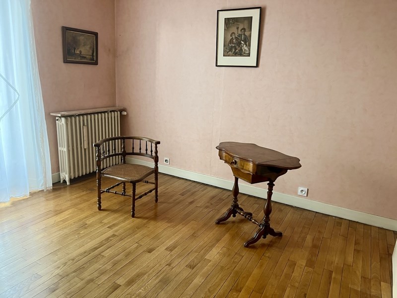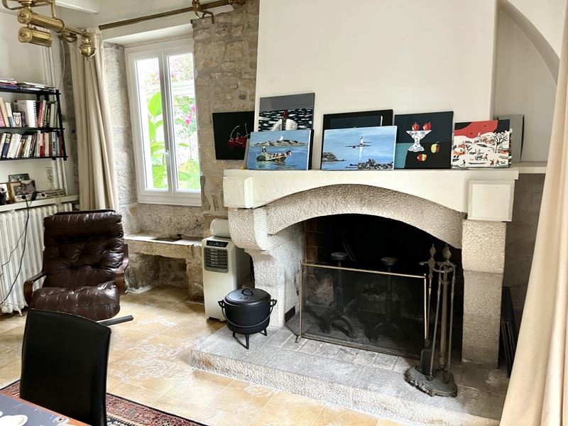 Dans un bourg avec toutes les commodités, maison de caractère composée au rdc : entrée, wc, salon/salle à manger avec cheminée, cuisine équipée, petit salon avec cheminée, bureau.