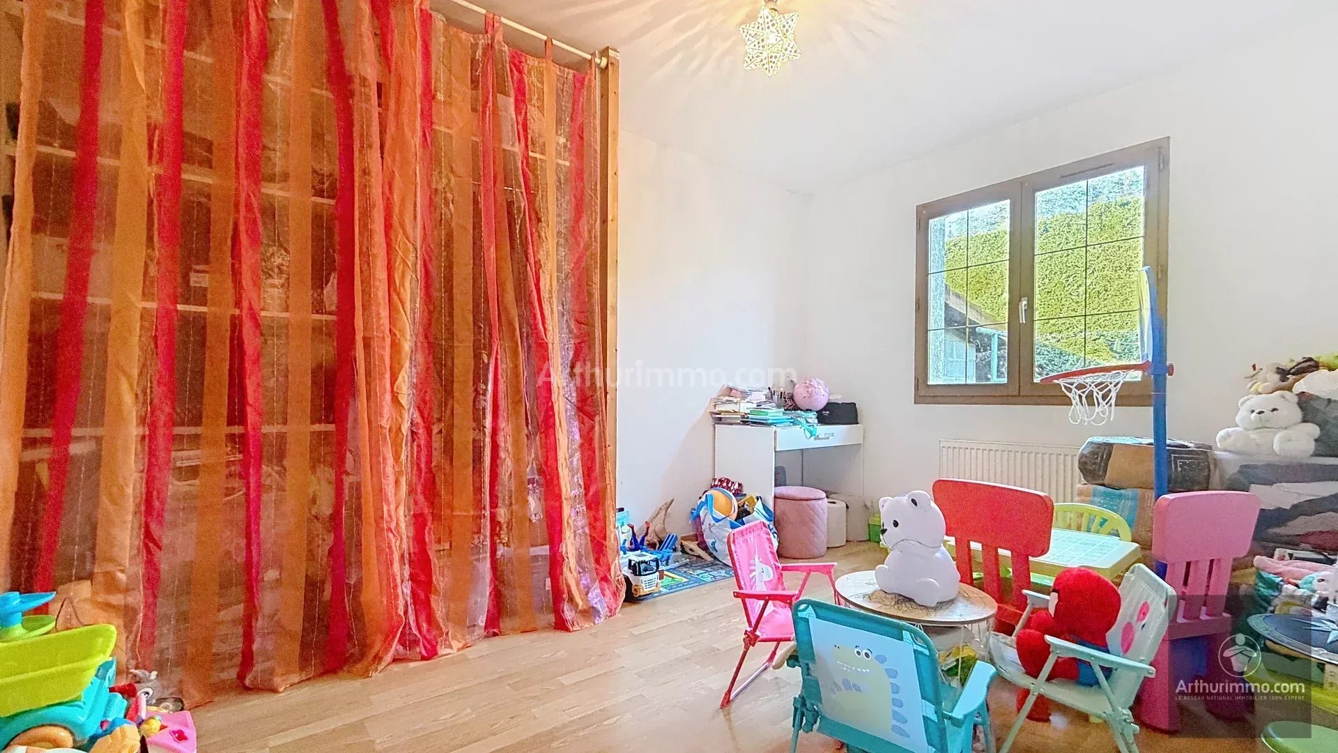 Elle se compose d'une entrée, d'un séjour d'environ 30 m², d'une cuisine américaine équipée, de 5 chambres, d'une salle de bains, d'une salle d'eau et de WC séparés.