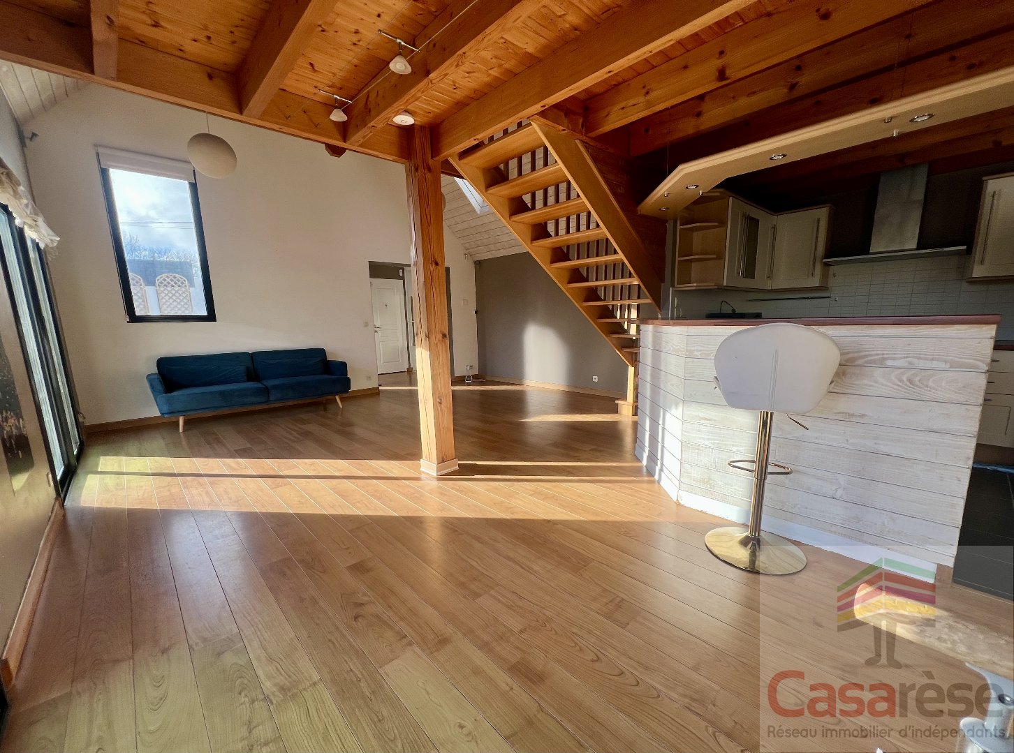 D'une conception moderne et très agréable à vivre, la maison se compose d'une grande pièce de vie baignée de lumière grâce à de larges baies vitrées.