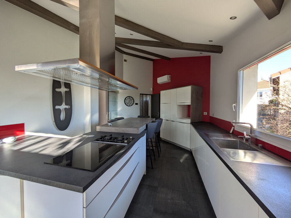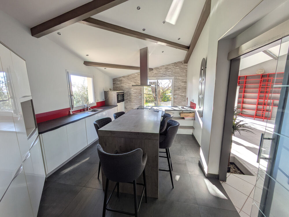 Elle dispose d'un vaste séjour-salon en deux parties pour une surface totale de 57 m2 avec une cheminée moderne et des baies donnant sur une terrasse sud. Très beau volume avec un plafond cathédrale. La cuisine équipée est récente et bénéficie de nombreux meubles de qualité, pour une surface de 22 m2 avec baie donnant sur terrasse. Grande buanderie attenante. On trouve également six chambres avec placards, dont un dressing pour la chambre parentale, une grande salle de bains et une salle d'eau. La maison dispose de caves, d'un petit garage et d'un abri. Le chauffage se fait par pompe à chaleur au sol + climatisations dans les chambres.