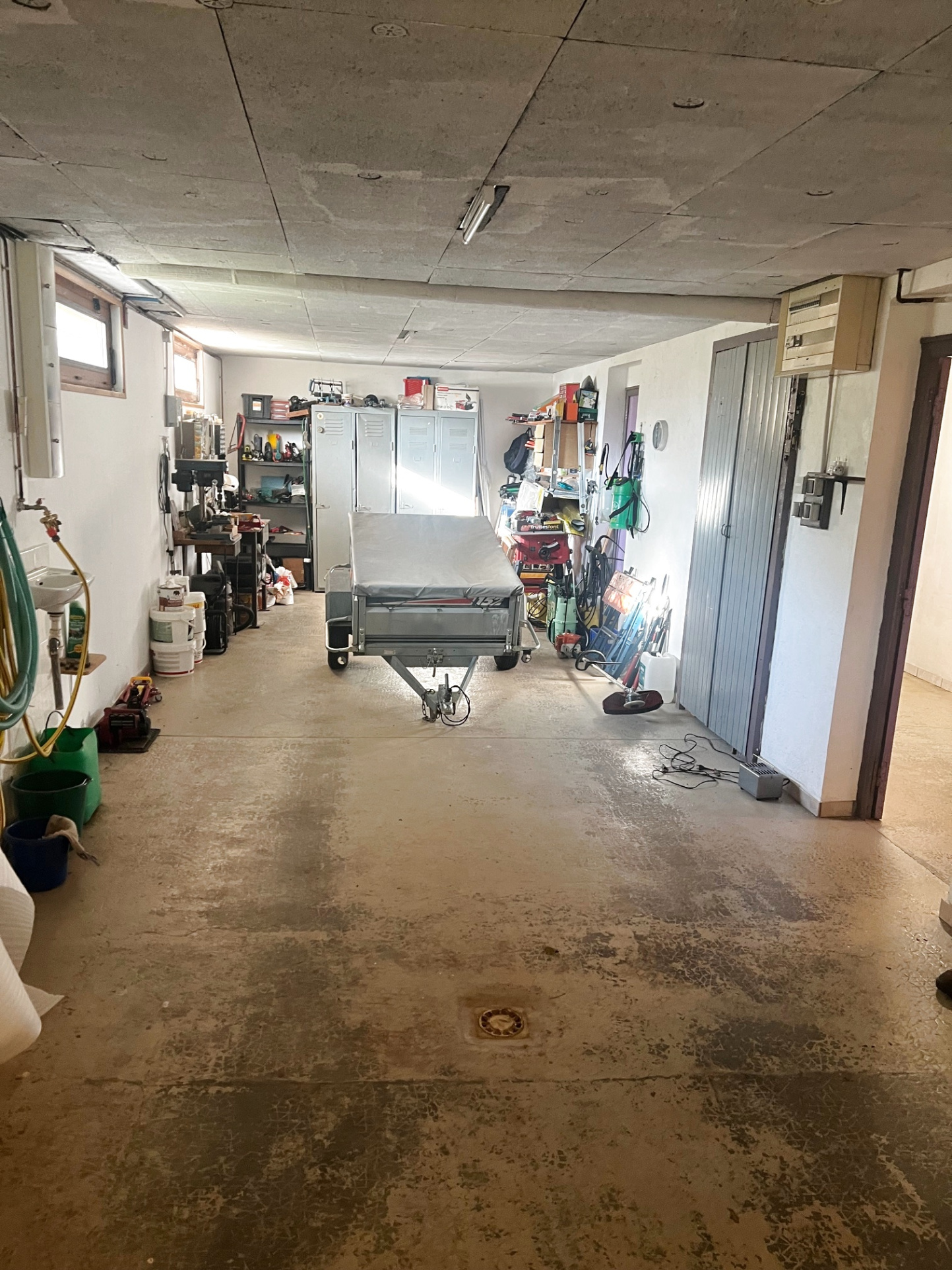 Elle est composée au RDC d'un hall d'entrée avec cheminée insert, d'une chaufferie/buanderie, 1 cave, 1 bureau, 2 garages dont 1 de 20m2 et le second de 38m2.
