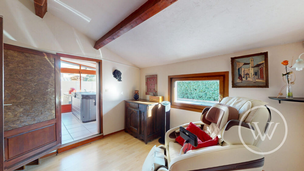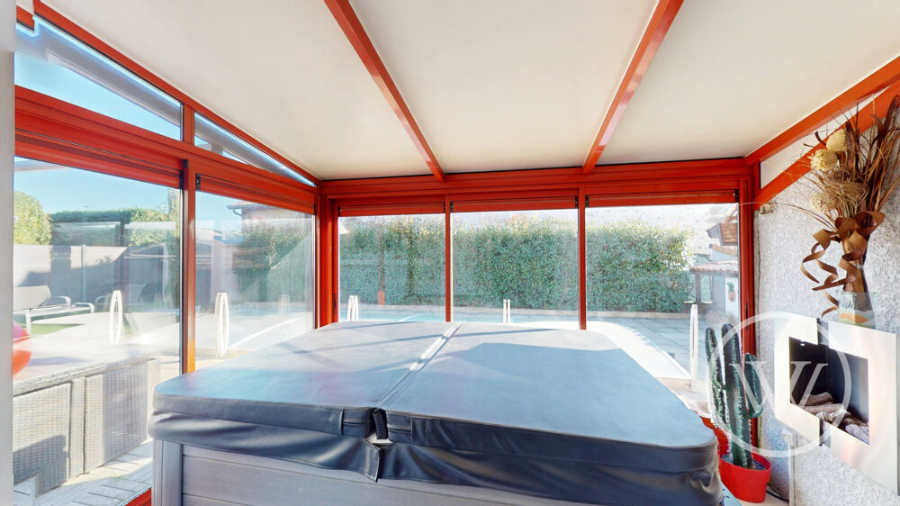 Les pièces de vie de plain-pied permettent l'accès direct à une véranda avec jacuzzi, un jardin clôturé et arboré, accueillant une piscine creusée, une terrasse avec store électrique et un espace détente.
