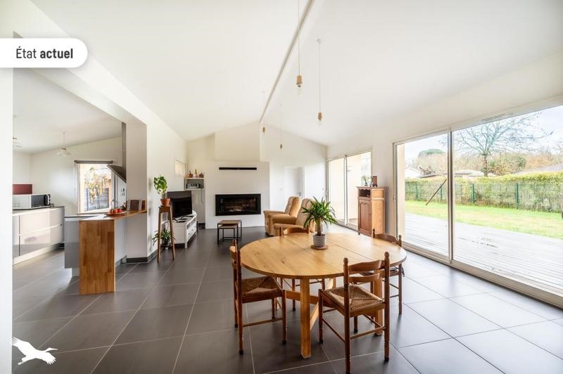 Entrée avec rangements, grand salon cathédrale exposé sud, cuisine semi ouverte équipée, cellier, une suite parentale avec salle d'eau, un coin enfants avec deux chambres et salle de bain, bureau.