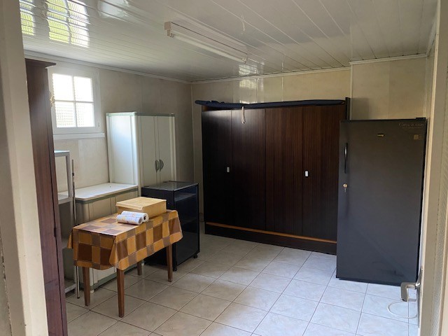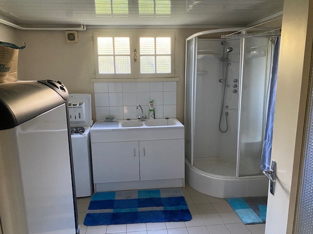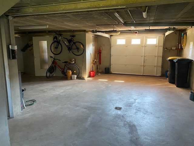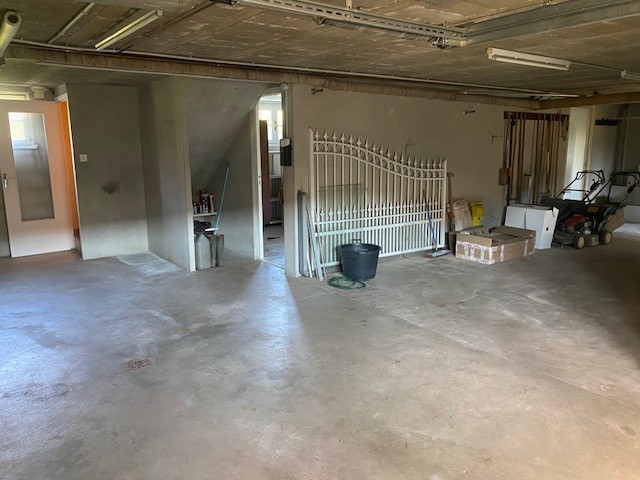 Le rez-de-chaussée, d?une superficie d?environ 100 m², comprend un grand garage (2 VL), un bureau ou chambre, une chaufferie avec douche et une cave enterrée.