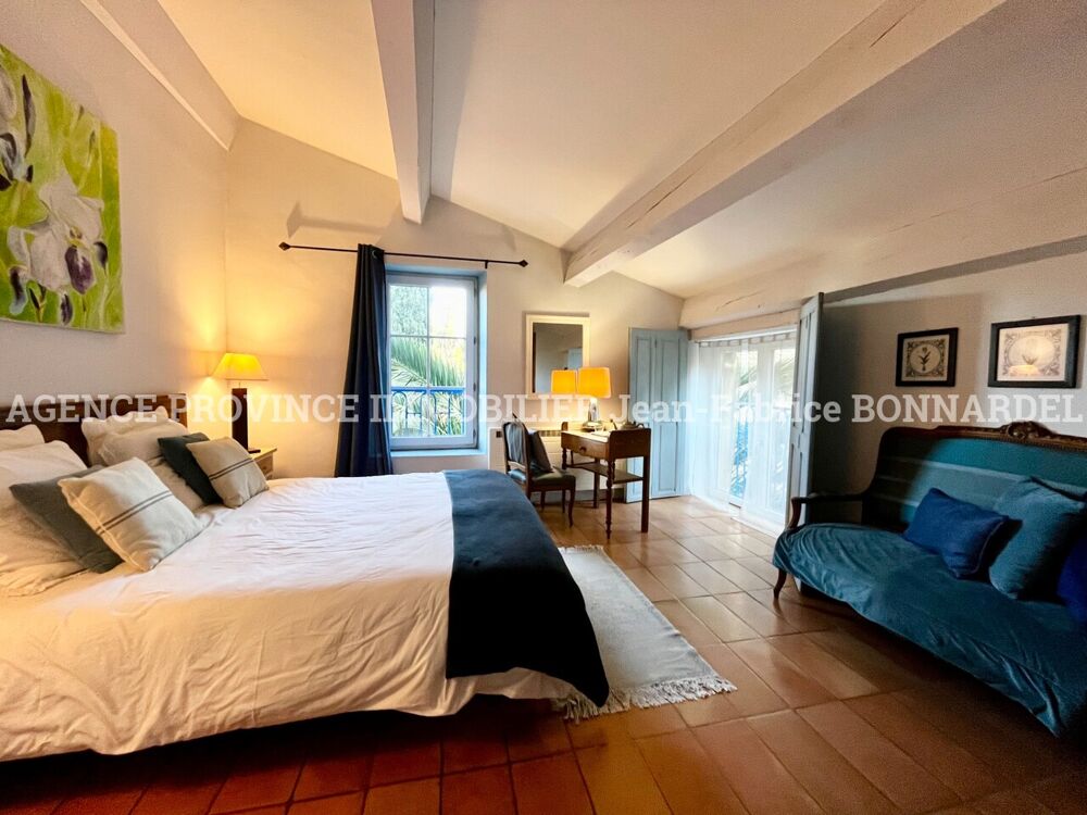 Au fil d'une discrète et agréable ruelle, apparaît ce Mas situé tout près des commodités d'un village provençal. Deux maisons se dévoilent alors, comme deux écrins de charme, mêlant subtilement l'authenticité d'un passé préservé au confort d'un art de vivre contemporain. Les volumes généreux, les matières nobles et la douceur de la lumière composent un décor empreint d'élégance et de sérénité, où l'on ressent immédiatement l'esprit du partage et de la convivialité. L'arrivée à la propriété se fait sous un porche en pierre majestueux, véritable seuil chargé d'histoire, qui donne le ton : ici, chaque détail respire le caractère et la poésie des lieux anciens. Au-delà, un jardin clos se révèle intime et soigneusement façonné. Terrasses ombragées, oliviers et arbres fruitiers, tout invite au repos, aux longues discussions d'été, ou simplement à savourer le temps qui passe. Au cœur du jardin, une piscine de type bassin, discrètement intégrée, semble flotter dans un écrin de verdure. Depuis ses abords comme depuis les terrasses, le regard se porte vers le château et les toits du village, panorama intemporel qui confère à la propriété une atmosphère presque hors du temps. La première habitation s'ouvre sur un intérieur chaleureux, dès le seuil franchi, elle dévoile son âme : lumière douce filtrant par les fenêtres… une ambiance authentique et sereine vous enveloppe immédiatement. La cuisine (26 m²), équipée et ornée d'une cheminée d'autrefois, invite naturellement à la convivialité, aux repas partagés, aux instants simples et précieux. Le vaste séjour (47,50 m²) déploie son charme silencieux. À ce niveau se trouve également une lingerie avec WC, discrète et pratique. À l'étage, un beau dégagement distribue quatre suites délicatement aménagées, chacune racontant une histoire par ses matières, ses couleurs, sa lumière. Une cinquième chambre, mansardée, ajoute à l'ensemble une note de rêve et d'intimité. Plus en retrait dans le jardin, la seconde maison offre un cadre intime. Au rez-de-chaussée, une belle entrée avec cave et un salon (26 m²) avec insert composent un univers à la fois cosy et raffiné, où l'on imagine volontiers les soirées d'hiver au coin du feu. À l'étage, un palier mène à une belle suite pleine de douceur. Le dernier niveau accueille deux chambres supplémentaires, chacune accompagnée de sa salle d'eau, offrant à leurs occupants un cocon de tranquillité.Honoraires à la charge de l'Acquéreur : non