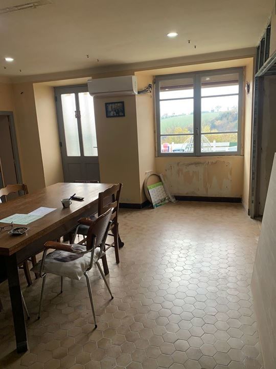 Une entrée de 2m2 donne accès d'un côté à une grange, de l'autre à la salle à manger de 23,50m2 ouverte sur un salon de 18m2 avec insert, et ouverte sur une terrasse de 77m2 avec belle vue sans vis à vis sur la campagne environnante.