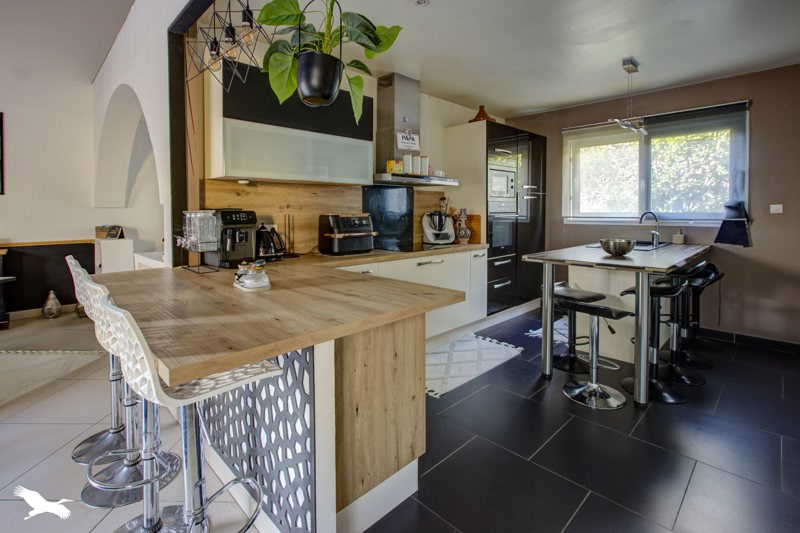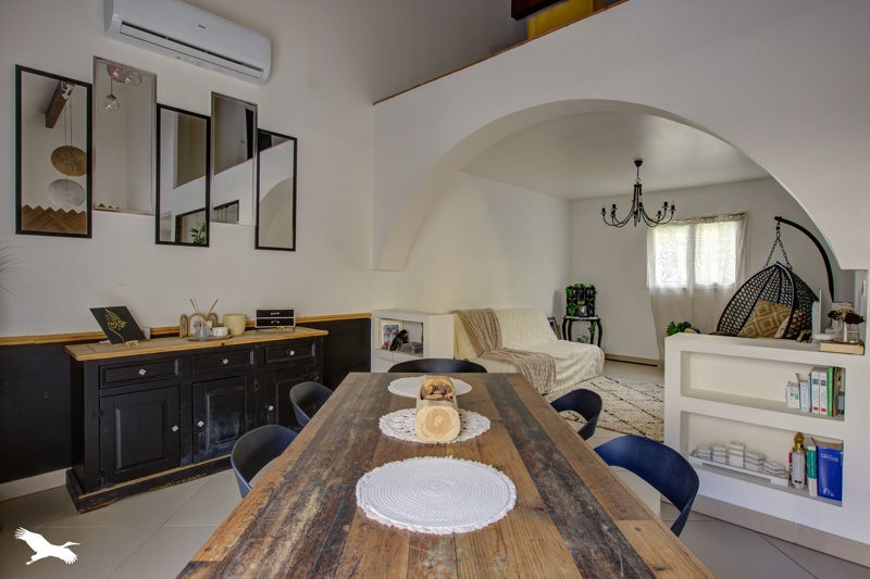 Ce bien dispose d'un coin jour avec une spacieuse pièce de vie avec cuisine américaine donnant sur cellier ainsi qu'un autre espace salon.