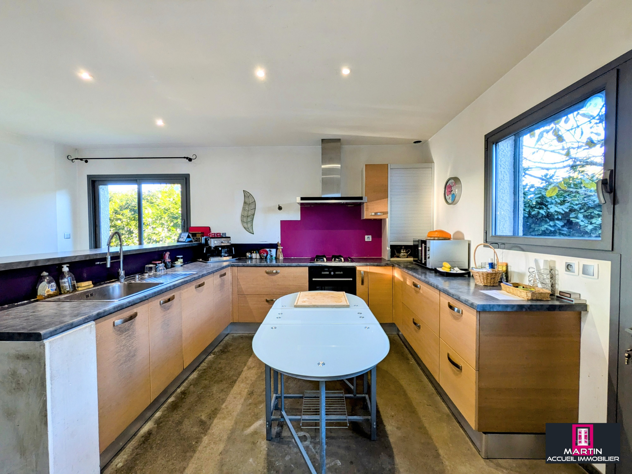 Une cuisine équipée ouverte avec sortie sur le jardin ombragé.