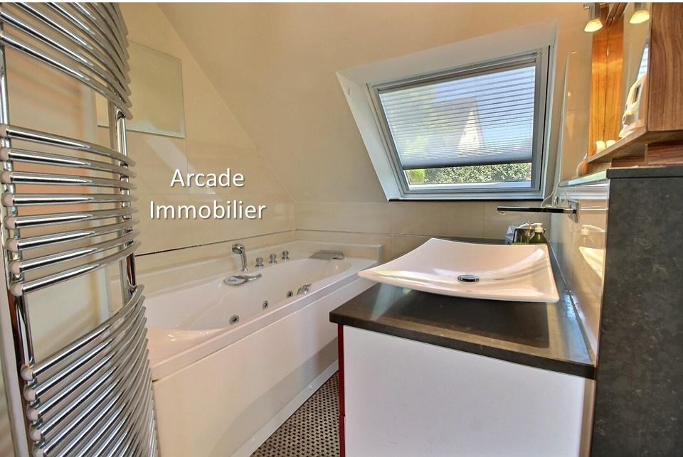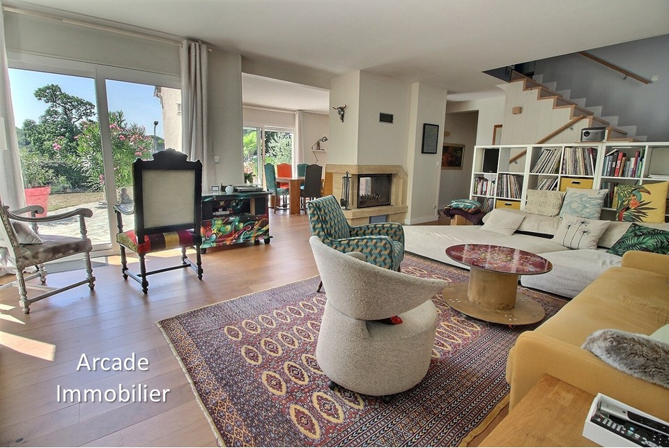 - au rez-de-chaussée : Entrée, séjour/salon de 47m2 avec cheminée et accès direct à la terrasse et au jardin paysager, cuisine aménagée, placards, WC