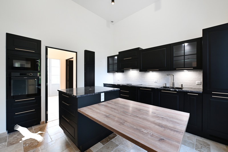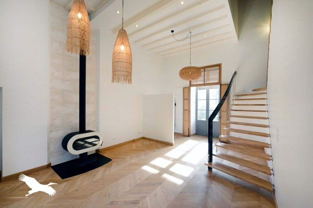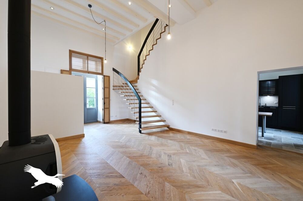 Au rez-de-chaussée : salon avec 4m de hauteur, poêle, cuisine haut de gamme et 2 jardinets.