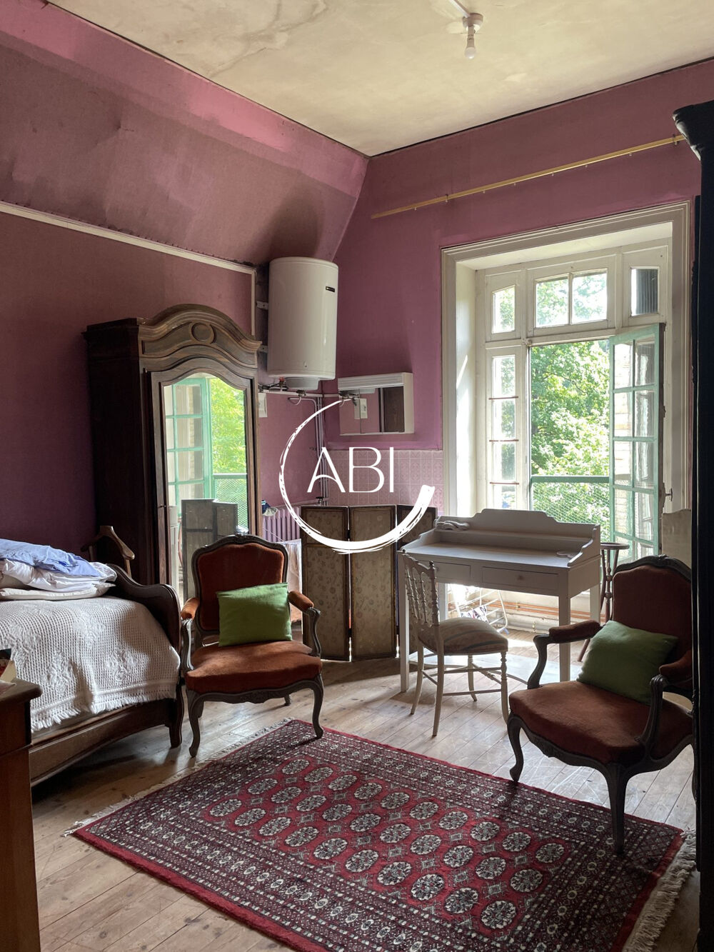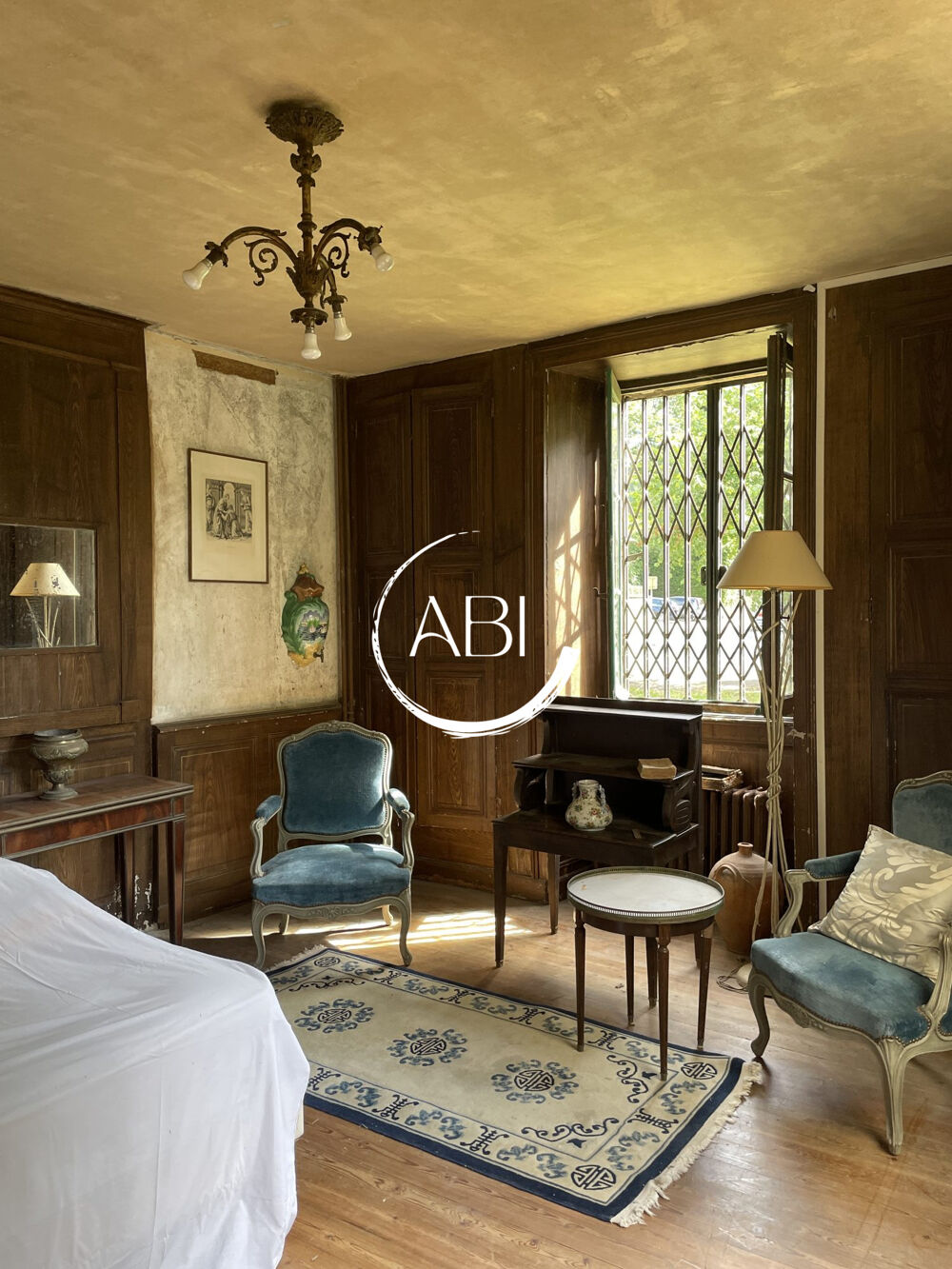 - ouvrant sur terrasse et un bow-window offrant une vue dégagée sur le parc, une authentique salle à manger de 22 m², une cuisine à aménager, une chambre.