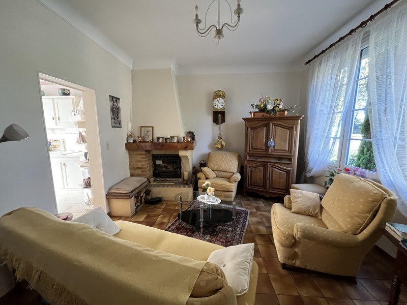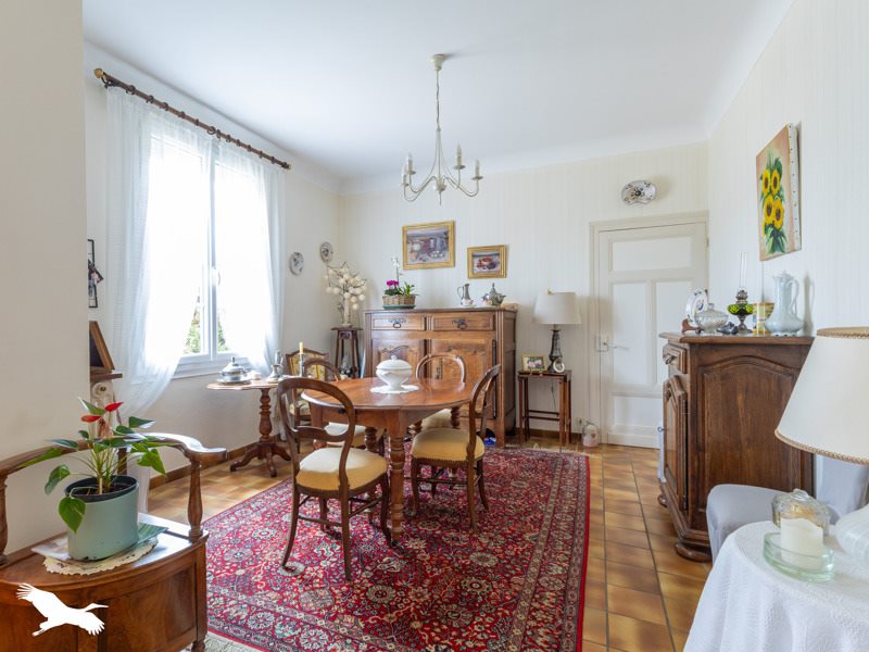 Séjour avec cheminée insert, salle à manger avec parquet.