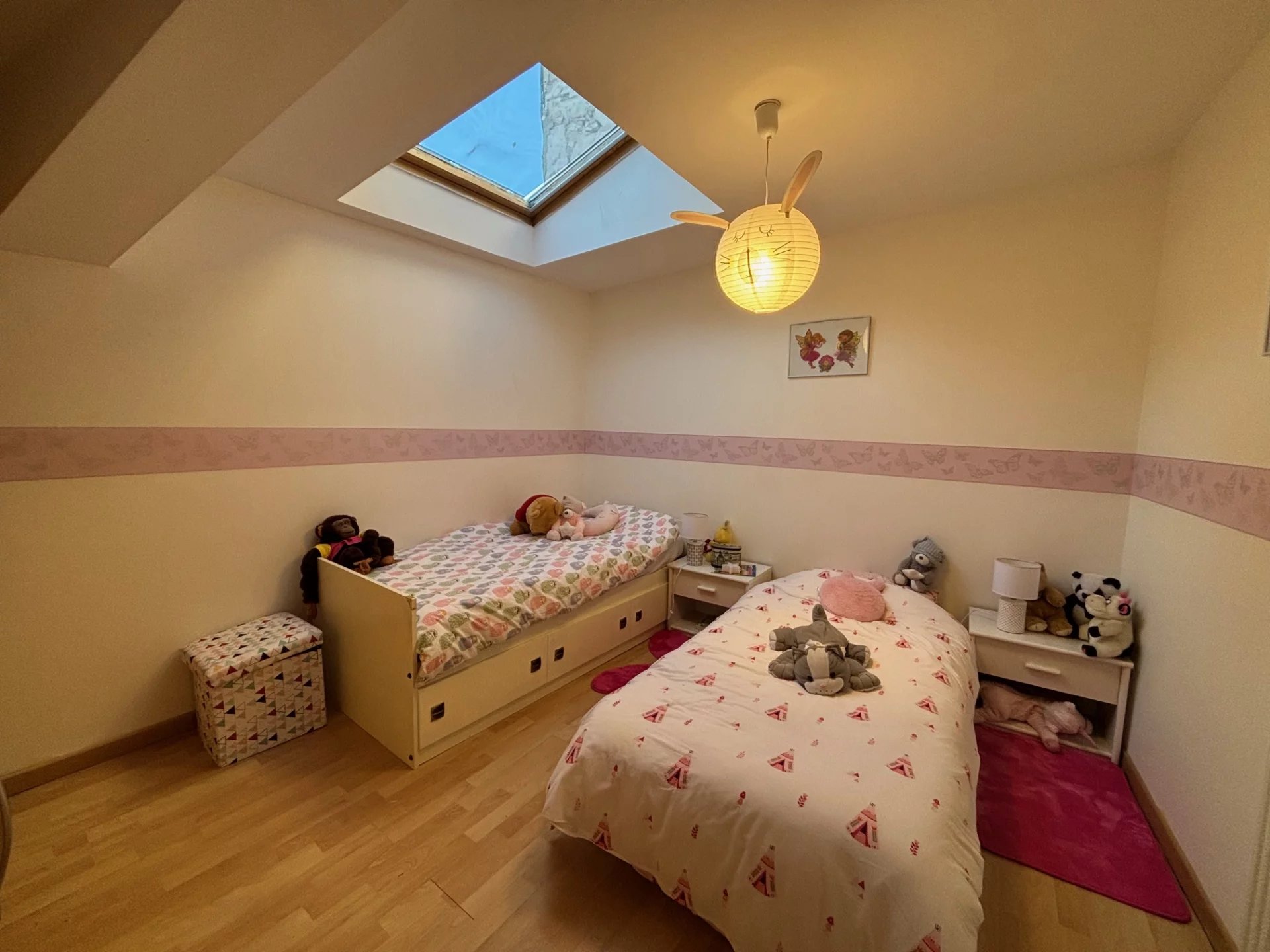 Idéale pour une famille, elle dispose de trois chambres spacieuses et de cinq pièces au total mais aussi 2 Garages et une cave.