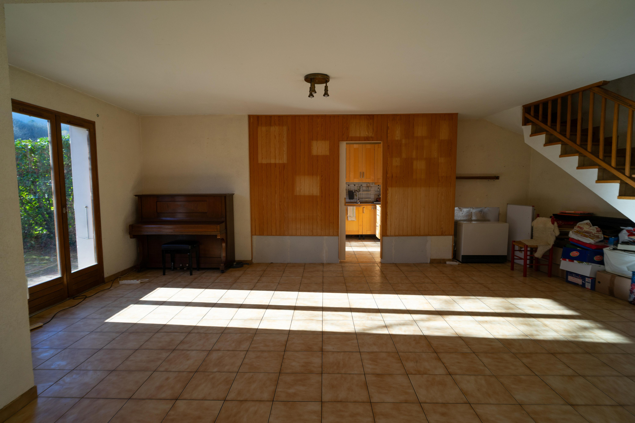 Espace vie de PLAIN PIED composé d'un séjour double (38m2) avec cheminée à foyer fermé, d'une cuisine adjacente (9m2 ouvrable sur séjour), vaste hall d'entrée, salle d'eau et WC.