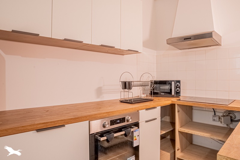Elle dispose d'une cuisine ouverte sur le séjour, deux chambres, une salle de bain, un wc séparé, un cellier avec espace buanderie.