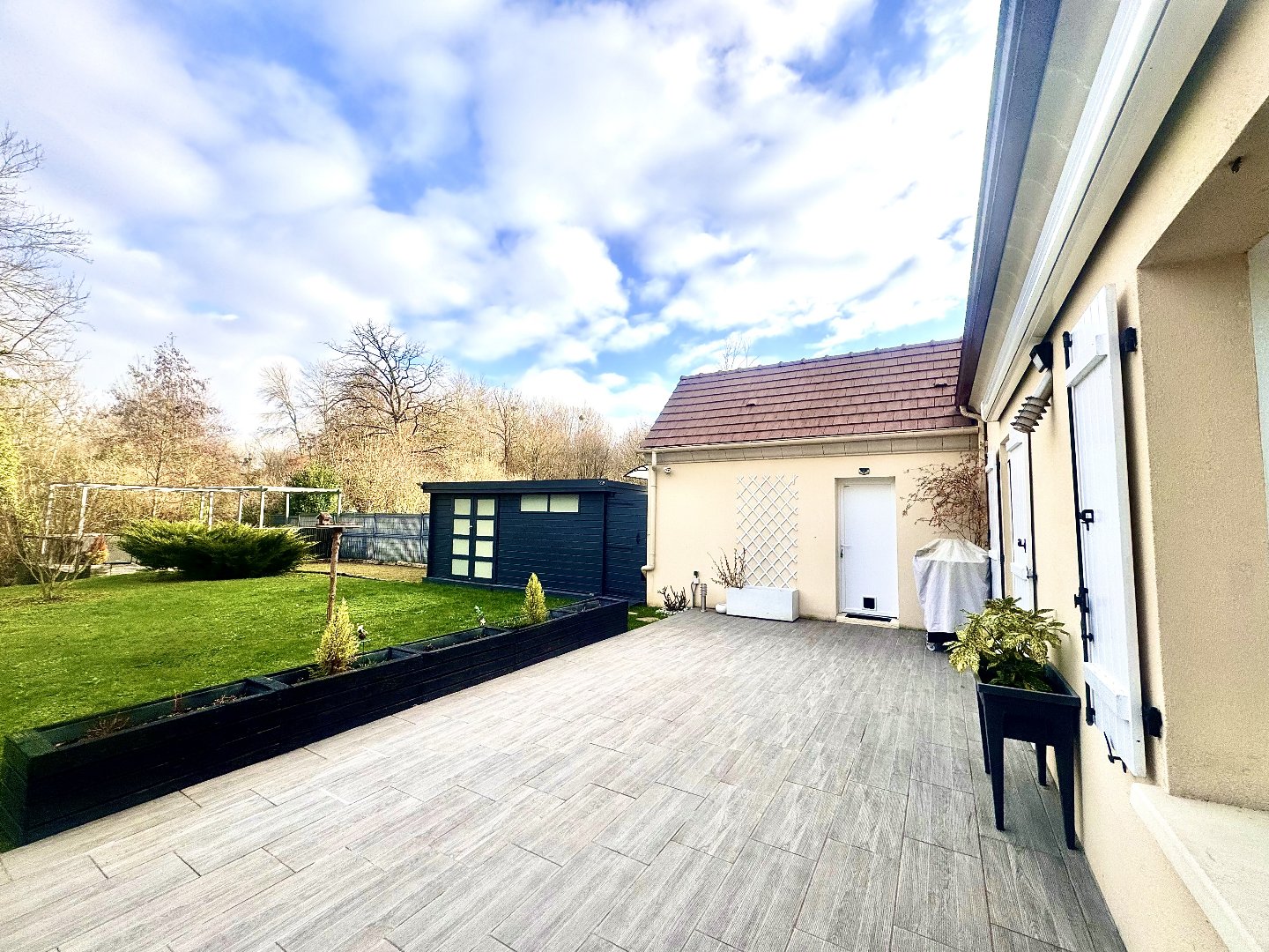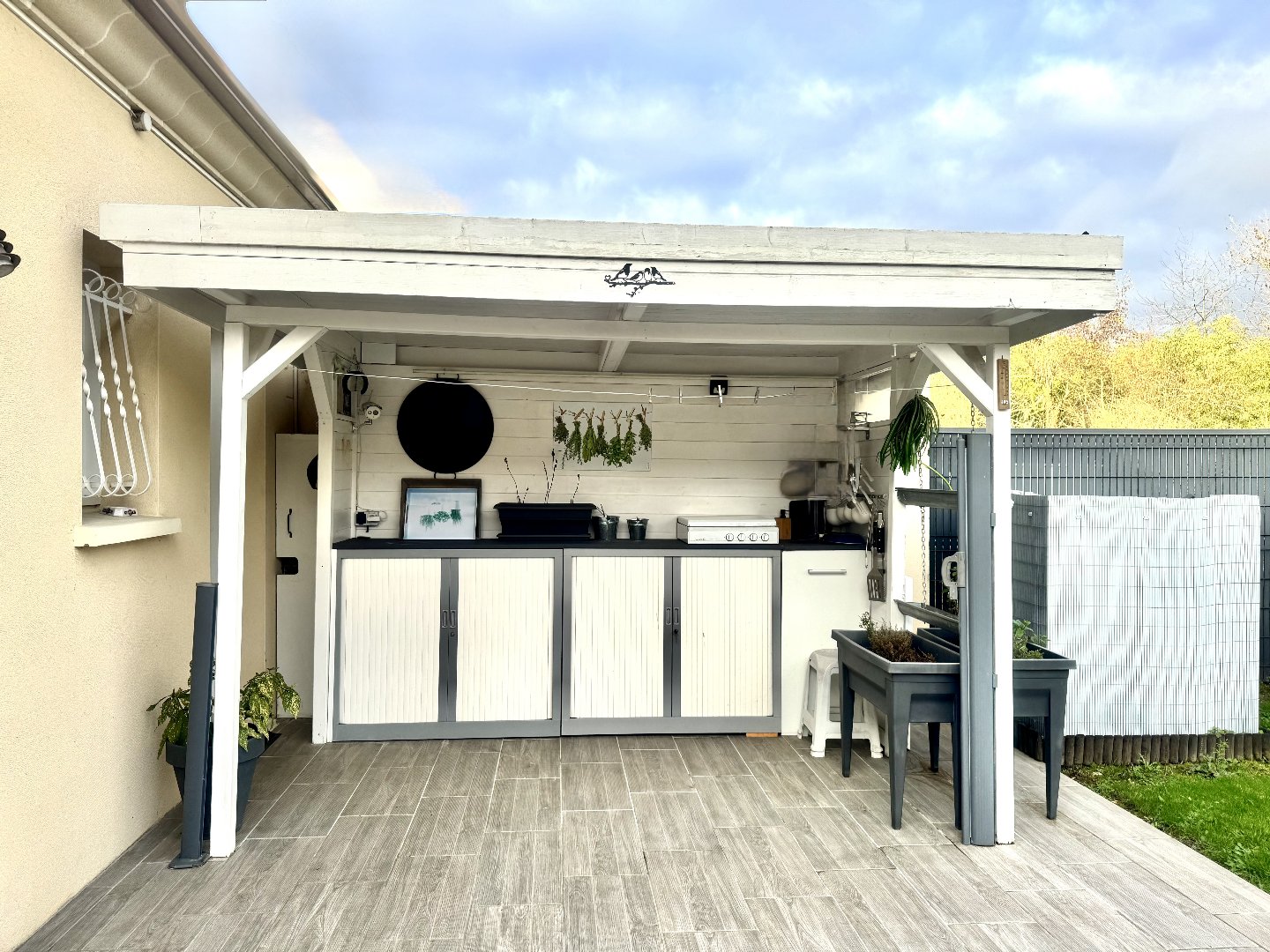 Côté extérieur, vous trouverez une cuisine d'été et barbecue sur une vaste terrasse carrelée avec store.