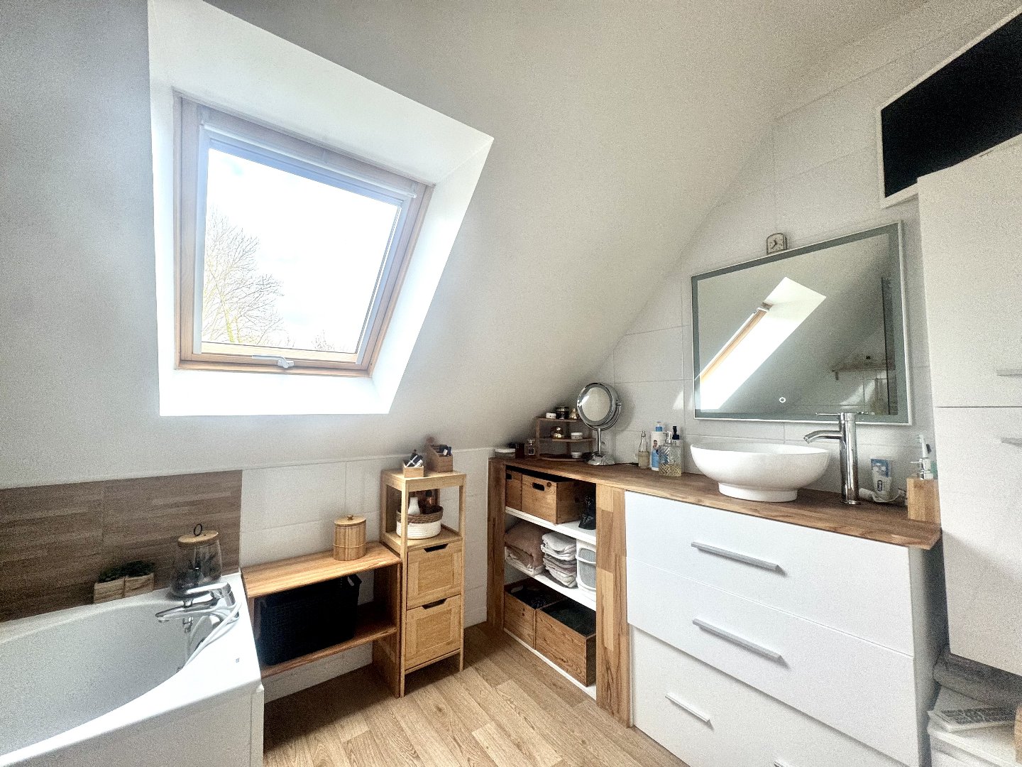 Le palier au 1er étage dessert 3 chambres, un wc ainsi qu'une salle de bain avec lavabo, douche à l'italienne et baignoire.