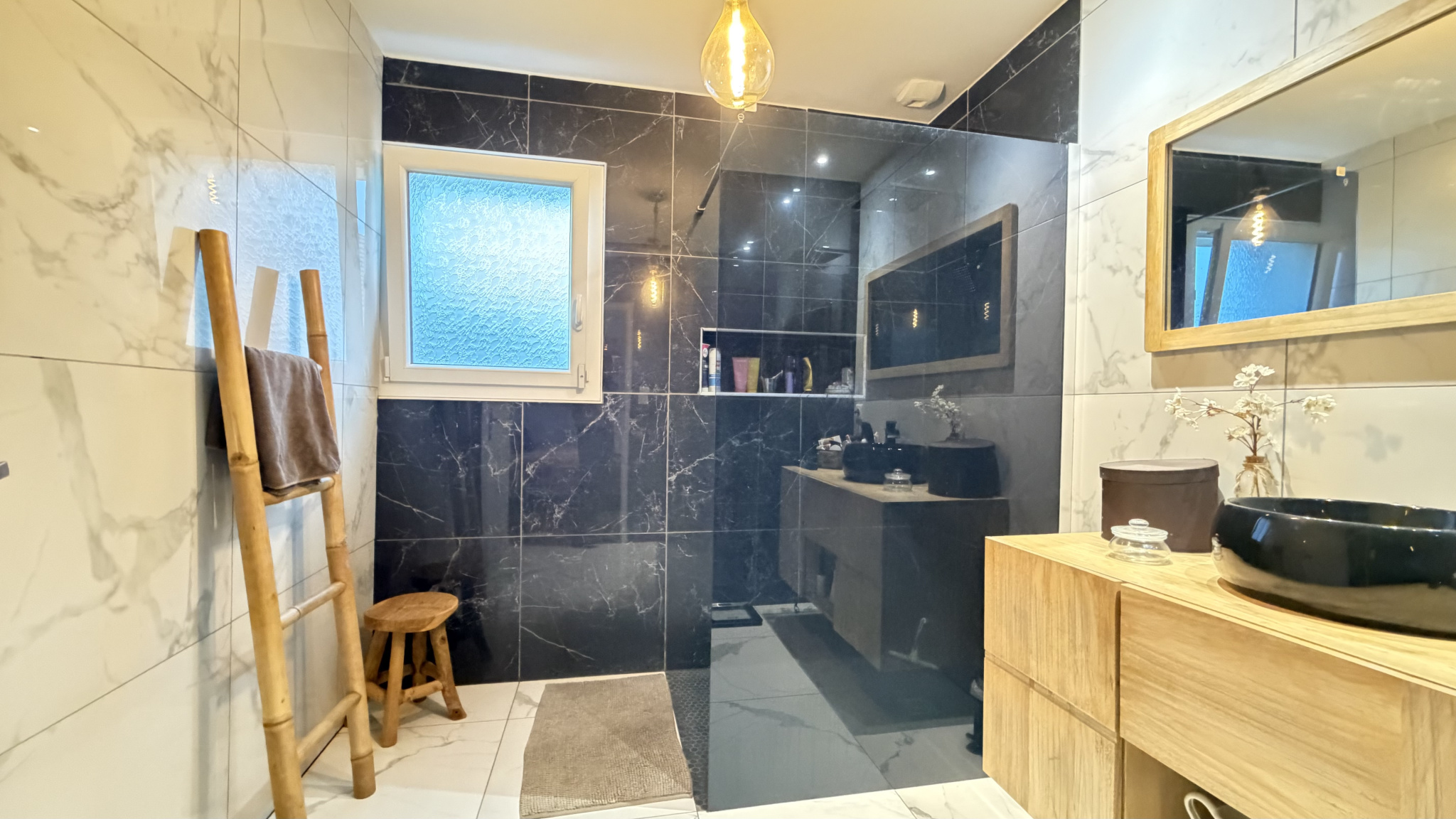 L'entrée s'ouvre sur une pièce de vie lumineuse profitant d'un beau volume. On y découvre un salon spacieux avec son mur en parement de pierre et une belle hauteur sous plafond, créant une atmosphère à la fois moderne et cocooning.