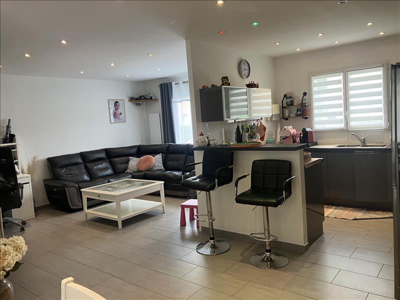 Maison de plain pied, comprenant une piece de vie avec cuisine aménagée ouverte sur le salon.