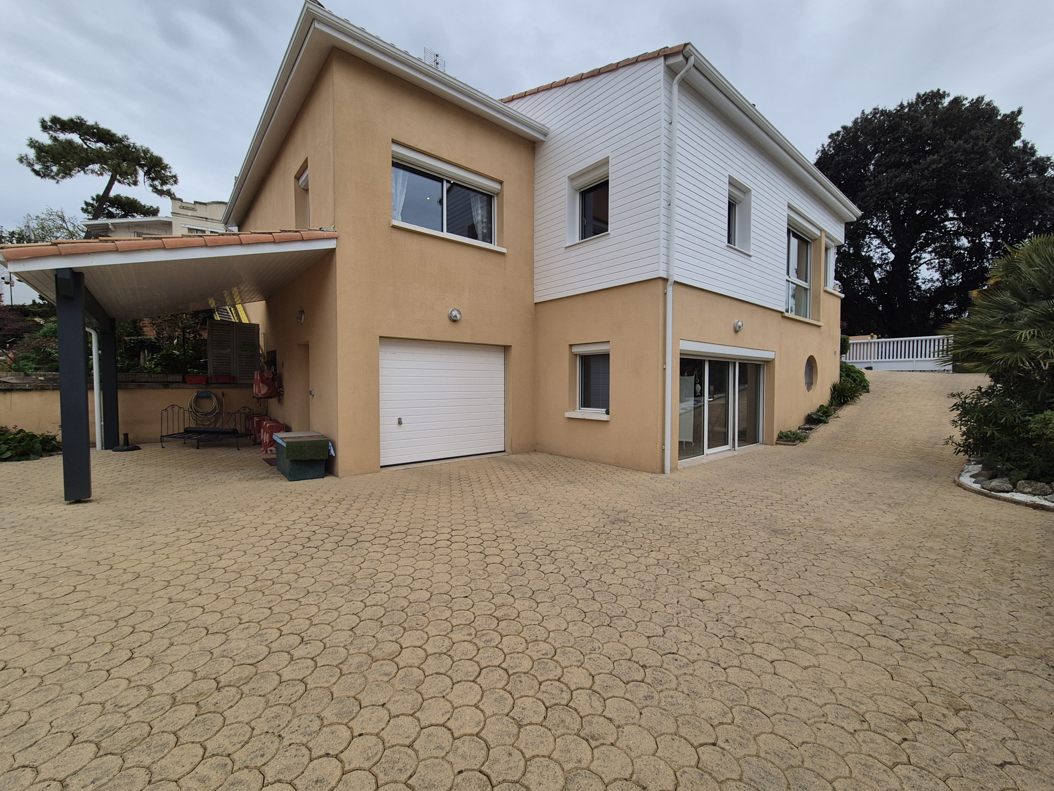 SAINT GEORGES DE DIDONNE. Très belle Villa d'architecte à quelques pas de la grande plage. Vous serez séduits par ses volumes et ses espaces indépendants. Au rez de chaussée : pièce de réception cuisine US de 51 m2 ouvrant sur patio et terrasse, suite parentale + dressing + salle de bains, WC, buanderie. Un deuxième espace de vie en descendant quelques marches composé d'un salon + mezzanine bureau, 2 chambres, salle d'eau + WC. En rez de jardin : bel appartement offrant séjour salon cuisine US, 1 chambre, salle d'eau + WC. 1 grand garage de 38 m2, atelier, cave. Terrain clos et végétalisé de 776 m2. Les informations sur les risques auxquels ce bien est exposé sont disponibles sur le site géorisques : www.georisques.gouv.frDétails :
