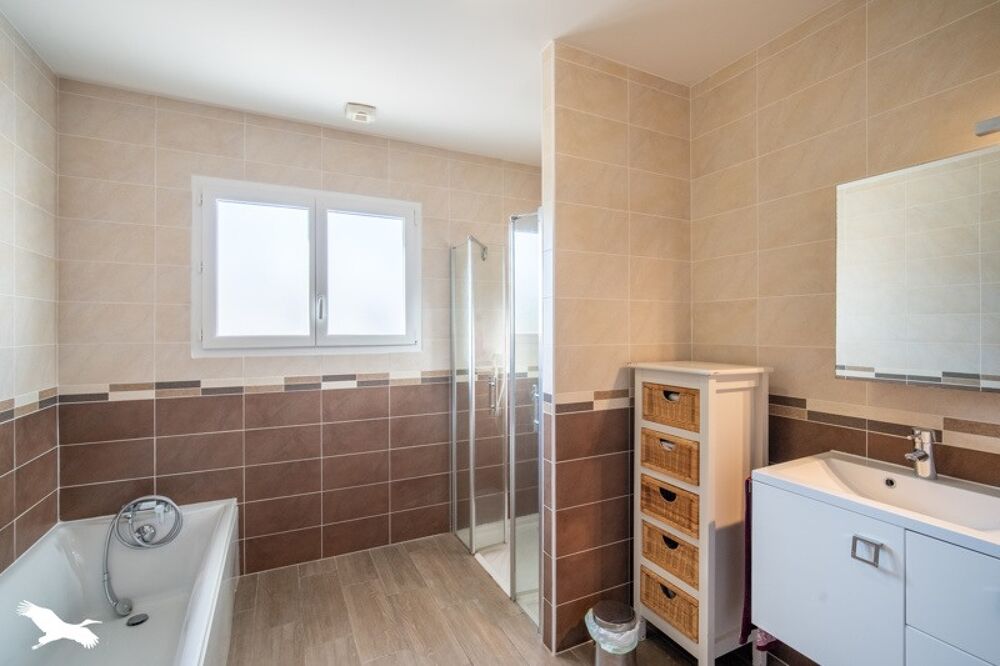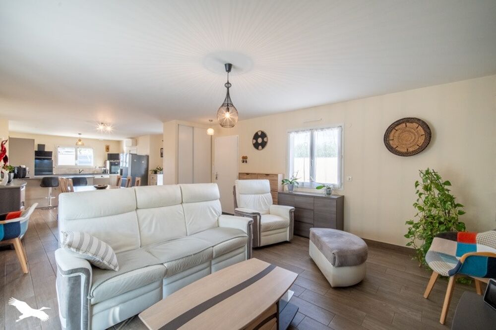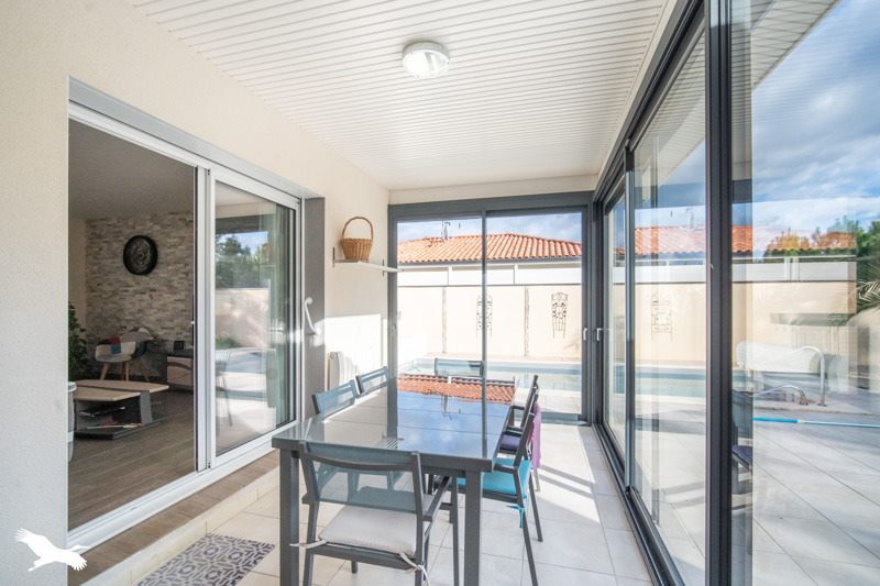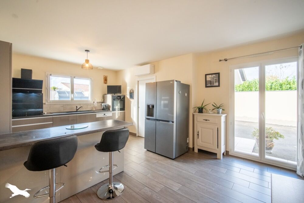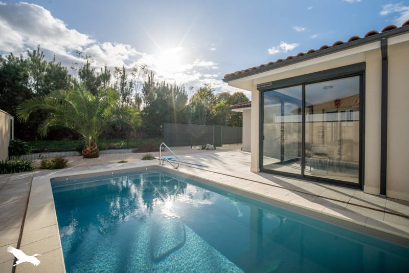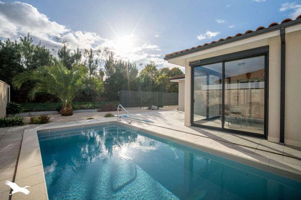 Maison contemporaine de plain pied proche commerce de premières nécessité.Composée d'une pièce de vie lumineuse,cuisine ouverte équipée,3 chambres,salle de bains avec douche,baignoire et double vasques.Grande terrasse,véranda avec une vue forêt et piscine chauffée.Le tout sur une parcelle d'environ 800m² et double garage.