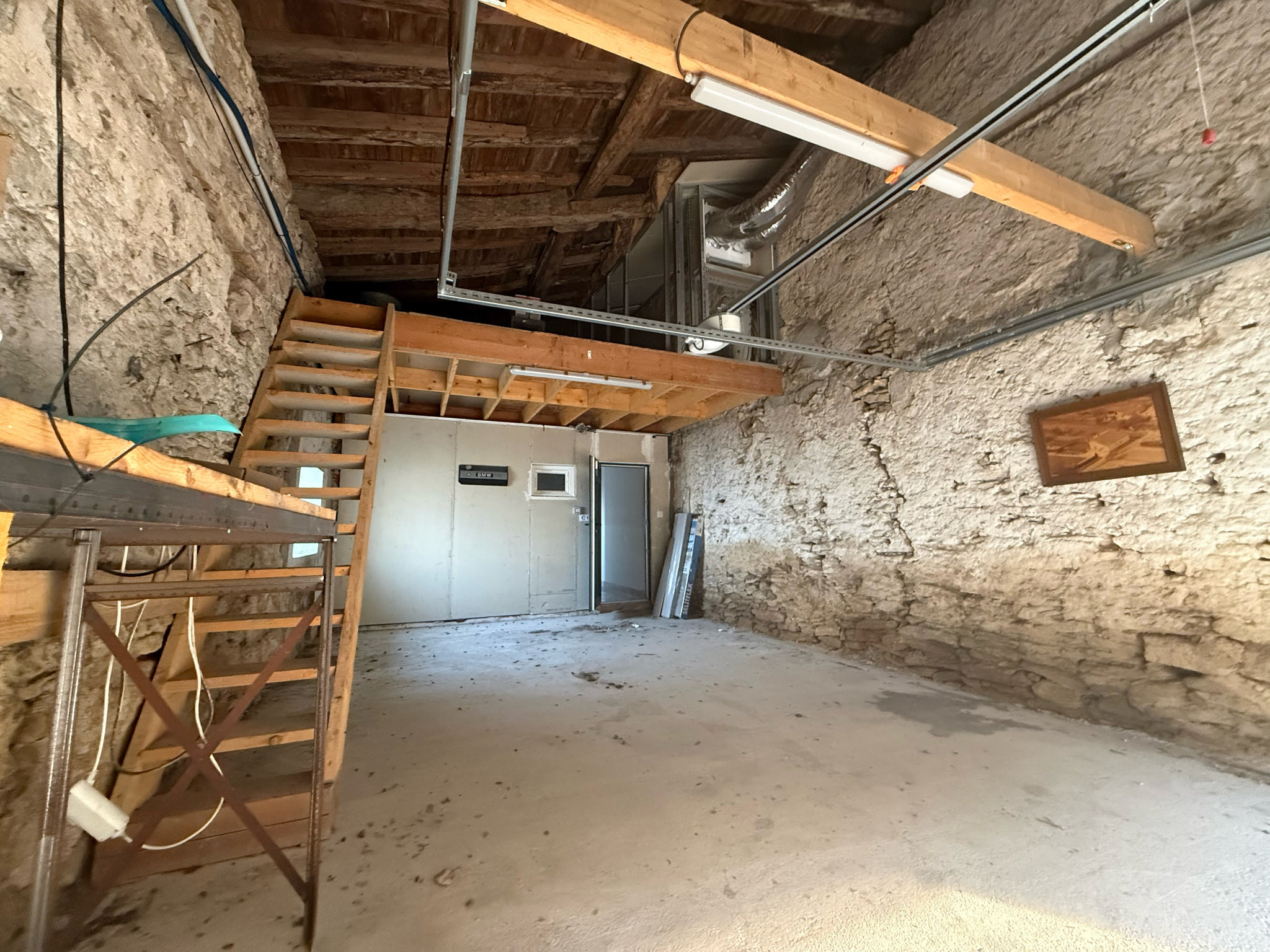 Un garage attenant d'environ 28 m2 équipé d'une porte motorisée avec mezzanine complète le bien. Celui-ci donne accès à deux pièces déjà partiellement rénovées, offrant de multiples possibilités d'aménagement : bureau, suite parentale supplémentaire ou deux chambres selon vos besoins.
