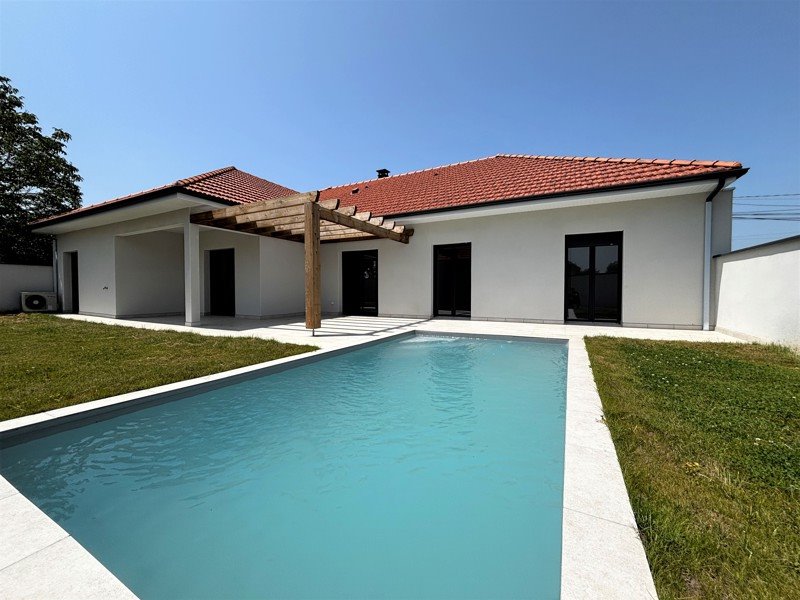 Profitez d'une pièce de vie baignée de lumière, d'un grand garage ainsi que d'un terrain aménagé avec pergola et piscine.