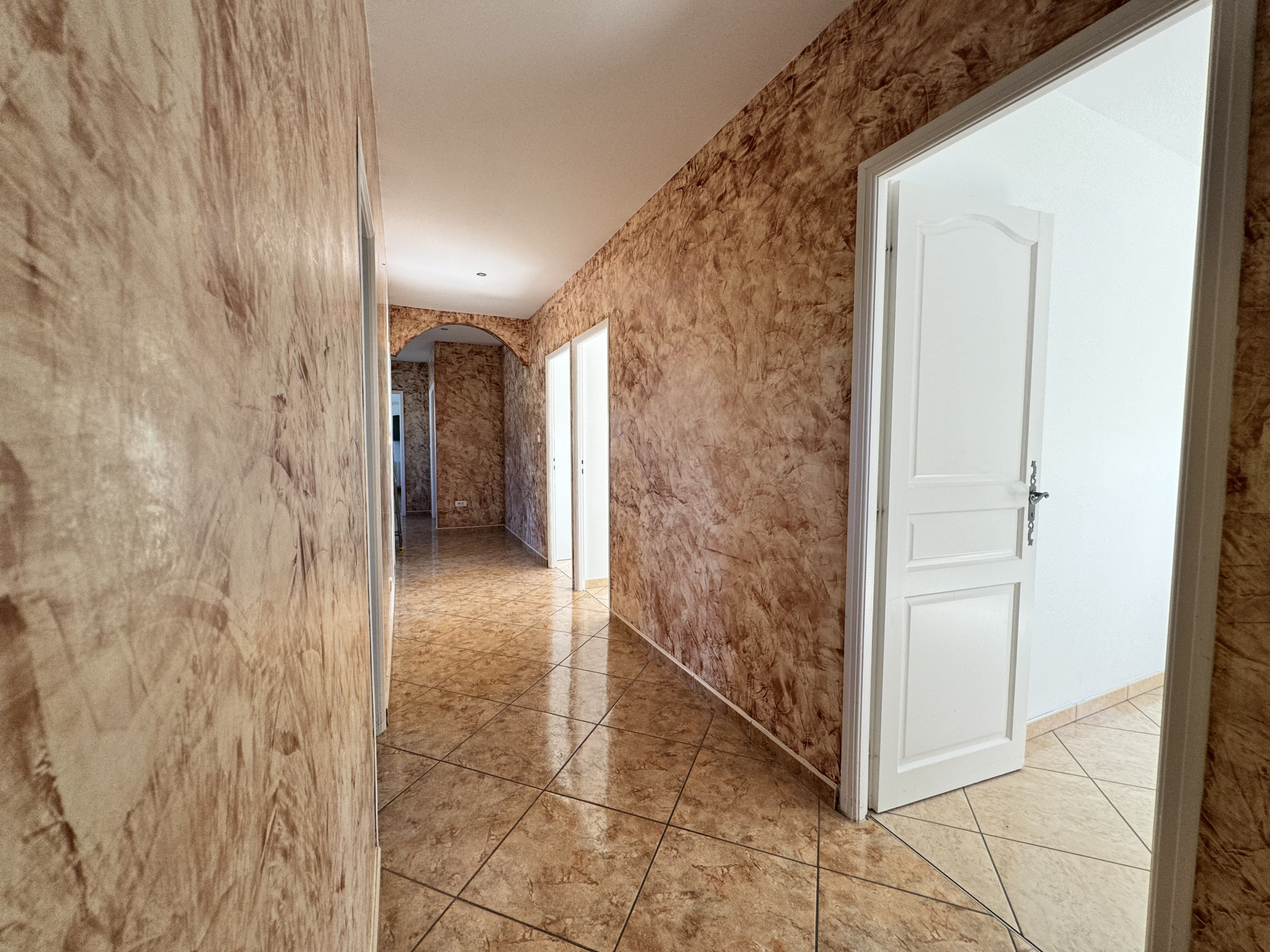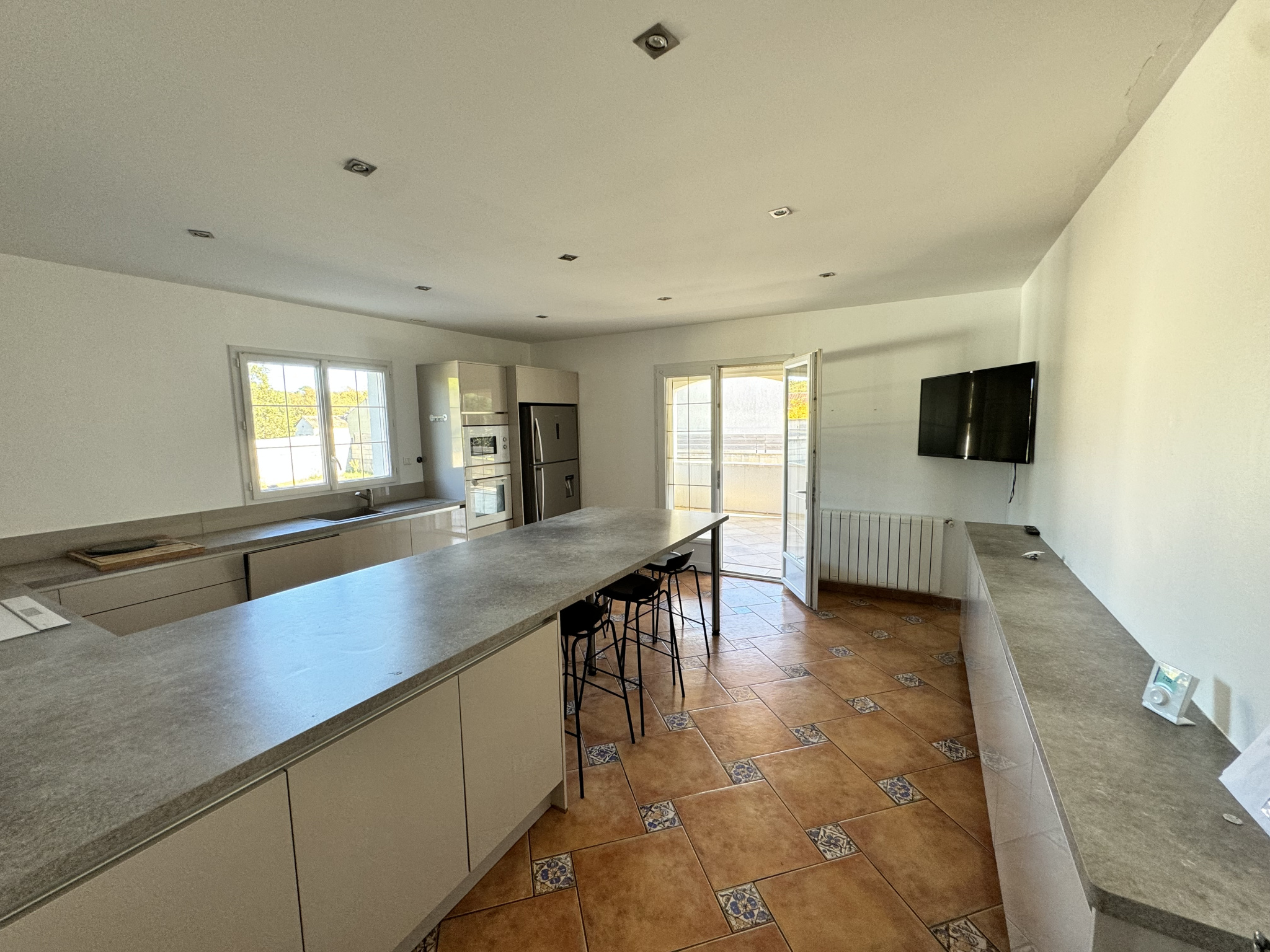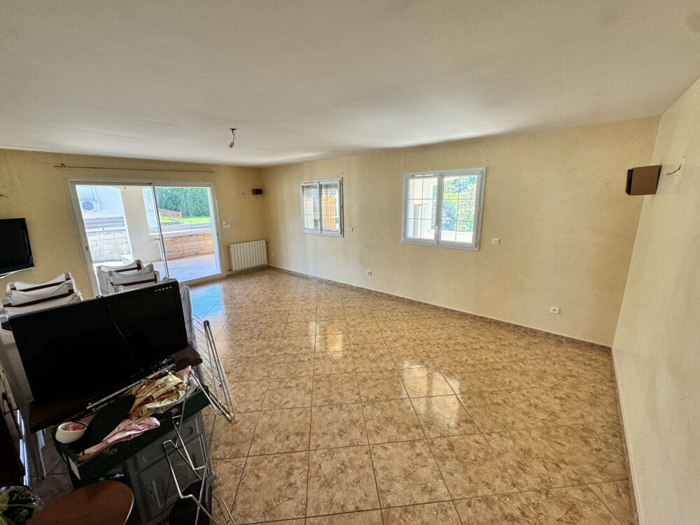 À l'intérieur, une entrée spacieuse mène à une cuisine moderne, un grand salon et une salle à manger ouverts sur une terrasse idéale pour recevoir. Quatre chambres, dont trois avec placards, une salle de bains avec douche et baignoire, et des toilettes séparées complètent cet espace.