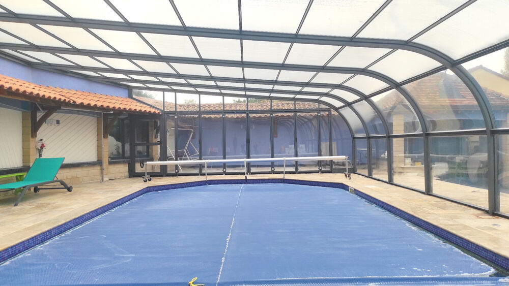 Grande terrasse avec piscine couverte et dépendances.