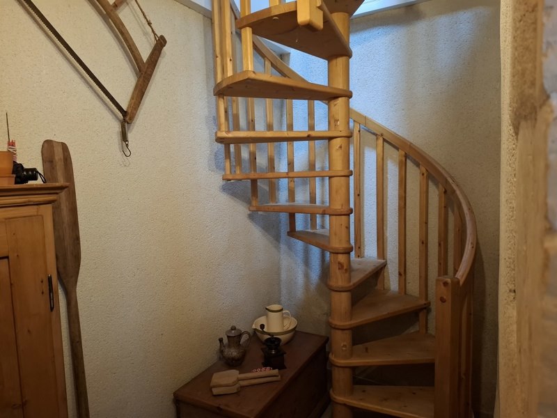 Séjour chaleureux avec poutres apparentes, poêle à bois, cuisine équipée, WC, et une agréable terrasse.