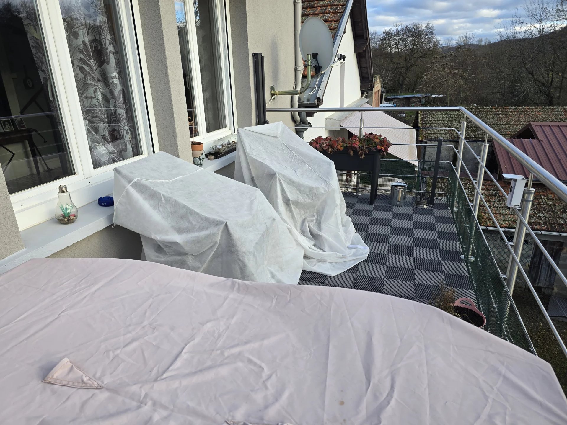 - séjour de 22.30 m² avec poêle à granules et donnant sur un balcon d'environ 10 m² équipé d'un store banne, bureau de 6.80 m², coin bar de 10 m², chambre de 10.70 m², dégagement avec placards, salle de bains de 3.20 m².