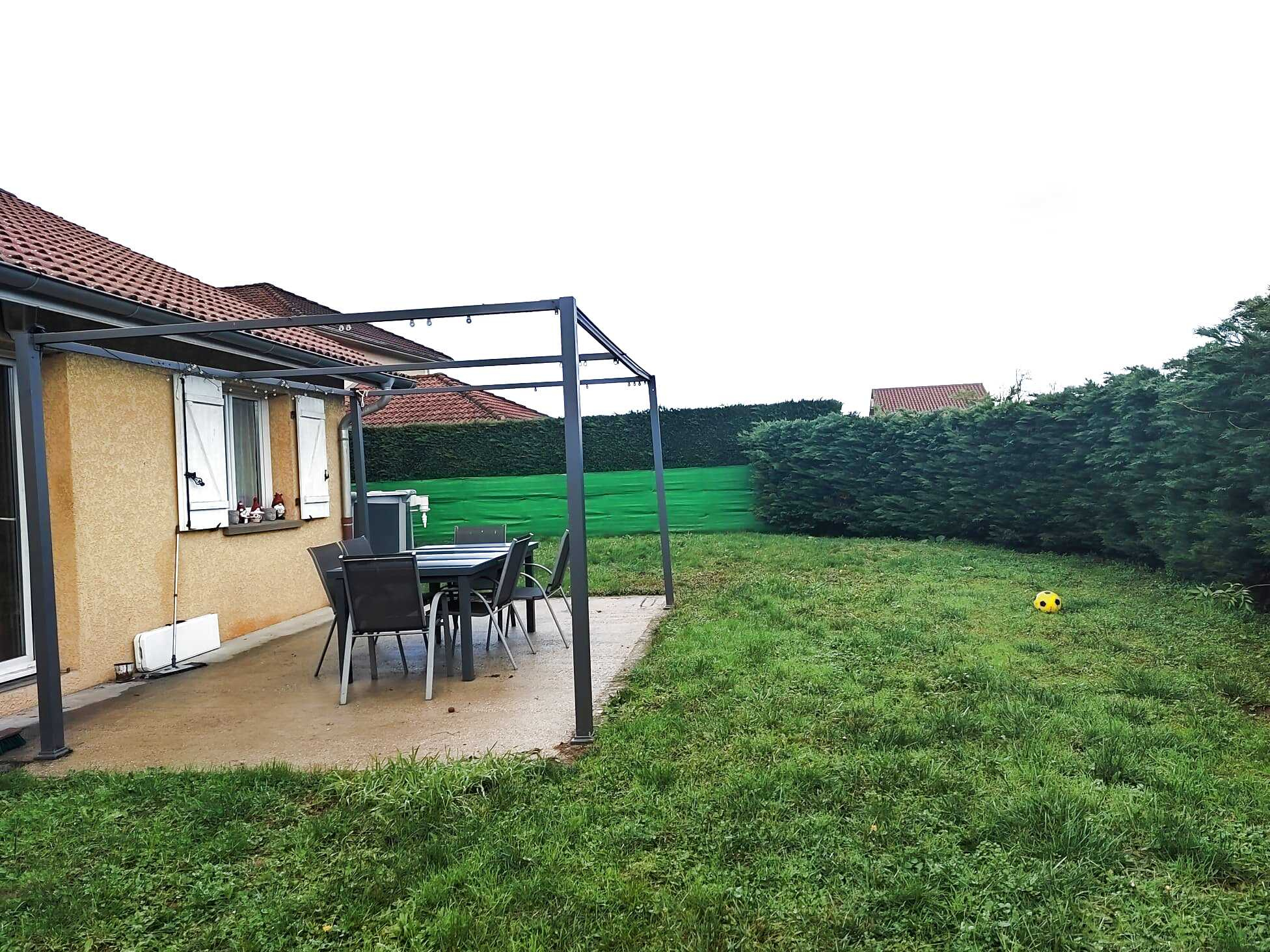 À l'extérieur, vous profiterez de deux terrasses d'environ 15 m2 chacune, d'une piscine hors sol, d'un garage indépendant de 35 m2, d'une cour intérieure et de deux places de stationnement. Le bien est raccordé au tout-à-l'égout.
