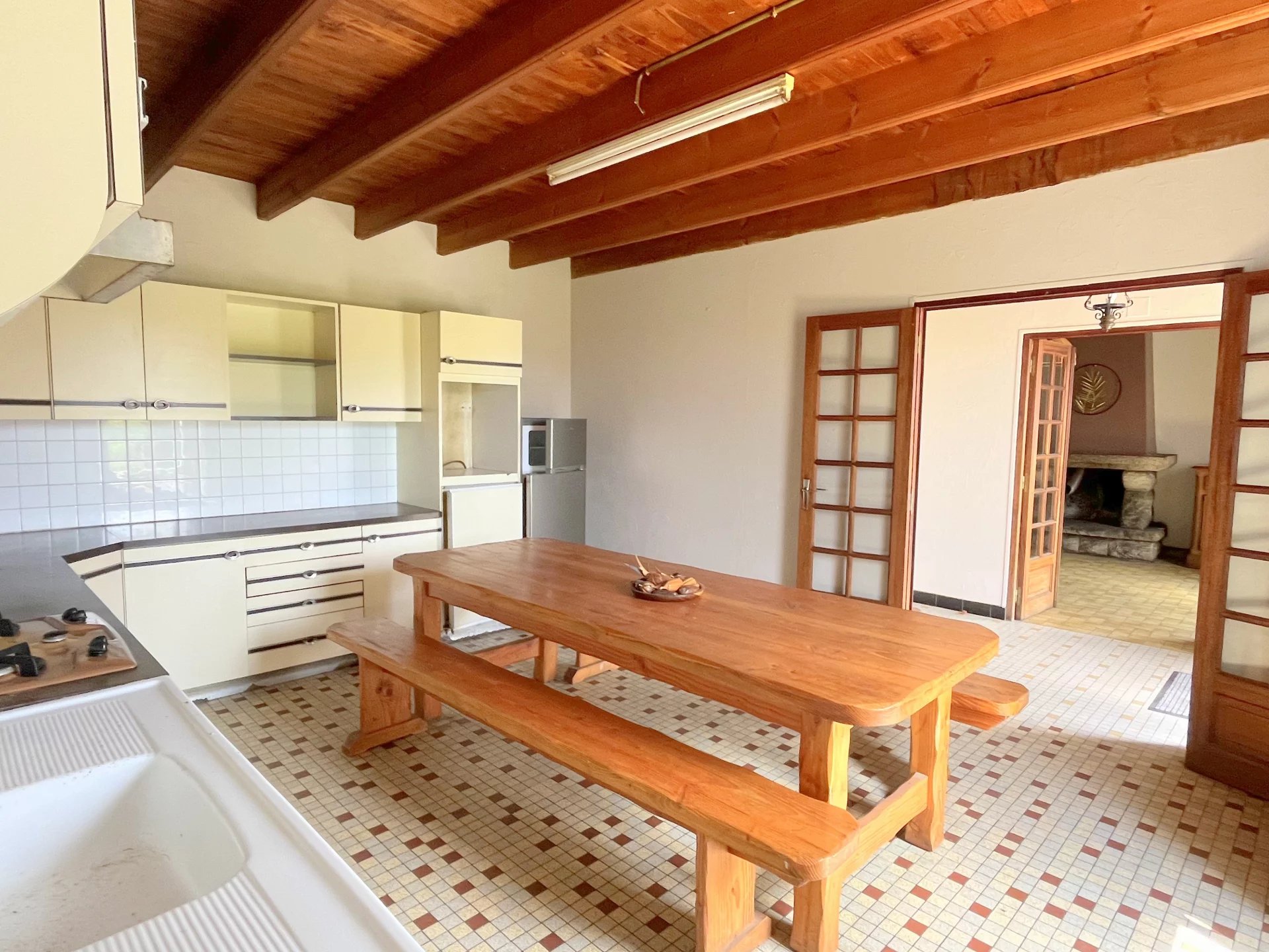 5 m²) WC indépendant sous escalier, Cuisine spacieuse (20,m²)Salon-séjour chaleureux avec cheminée ancienne (19 m²)