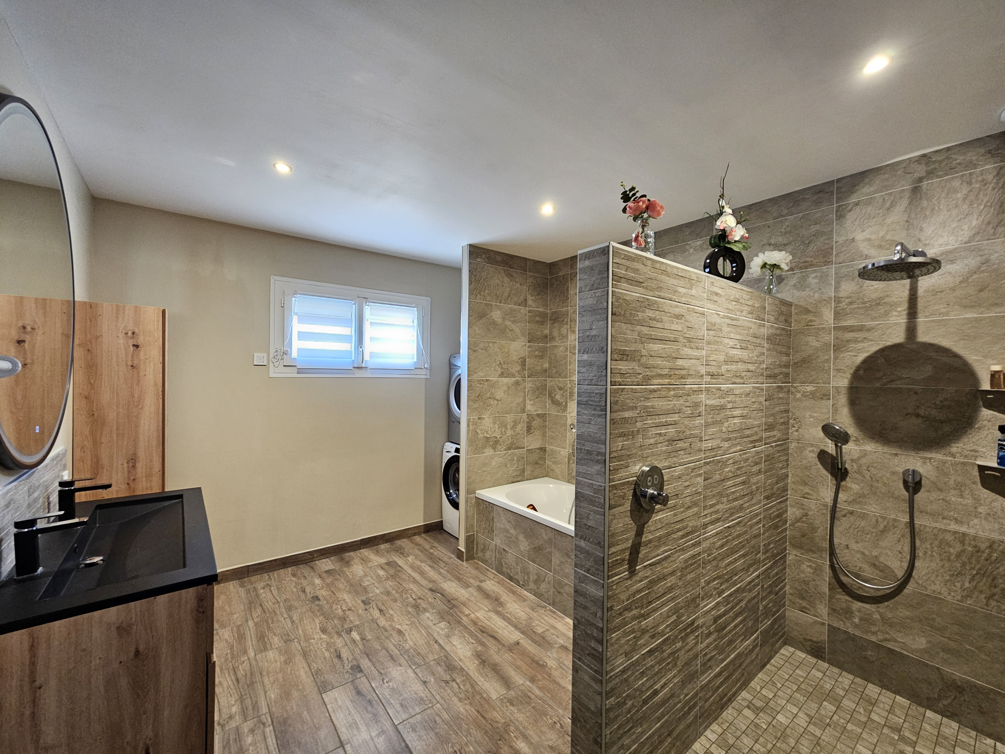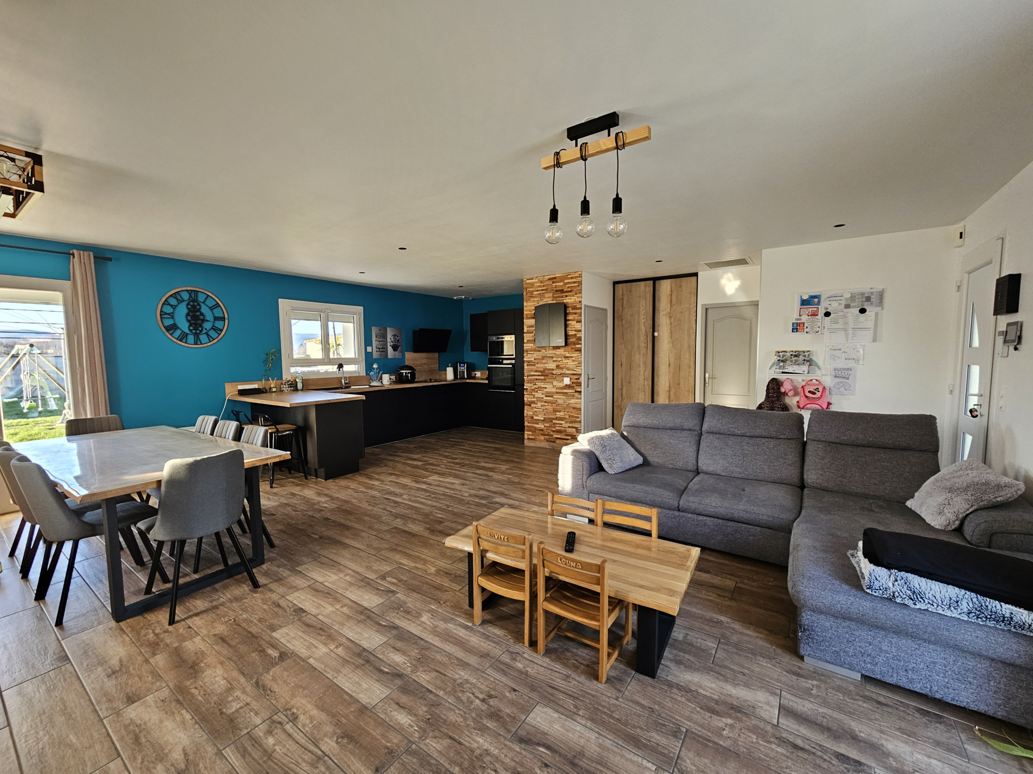 Cette maison se compose de la manière suivante: vaste et lumineuse pièce à vivre ( triple exposition) avec cuisine américaine entièrement équipée totalisant 53m2, cellier de 5m2 avec cumulus neuf 300 litres, 4 belles chambres de 12, 12, 12 et 16,5m2, salle de bain de 12m2 avec meuble double vasque, douche italienne, et baignoire, 2 WC.