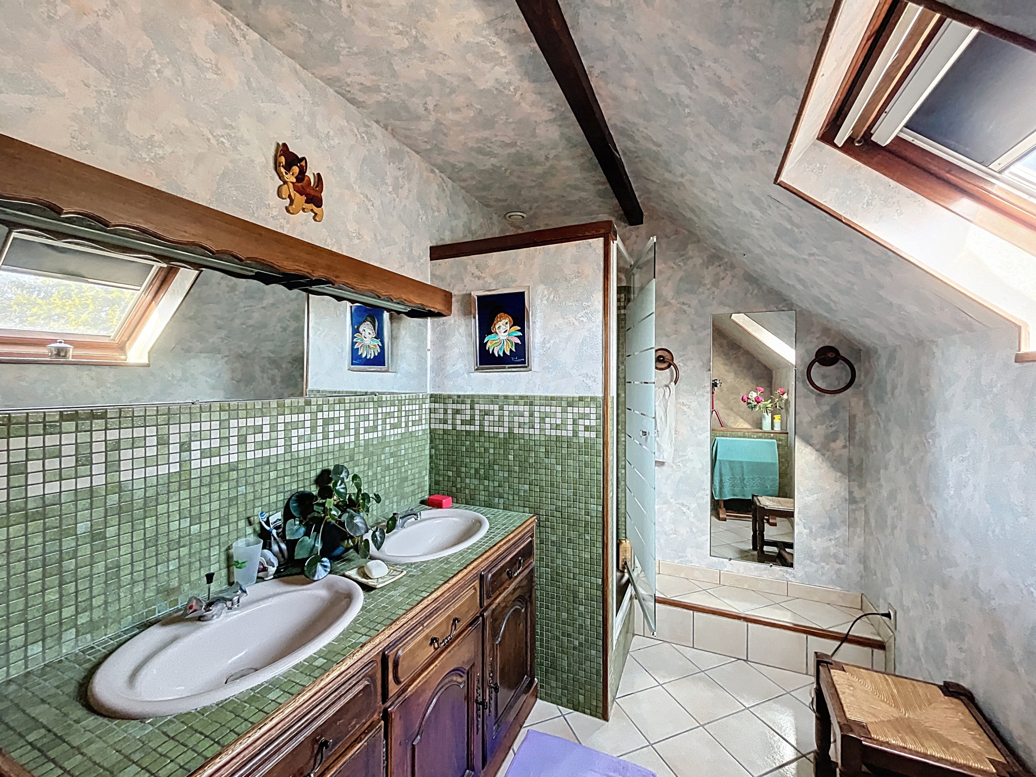 - Salle d'eau (7,63m2) : carrelage, double vasque sur meuble, douche, velux, convecteur.