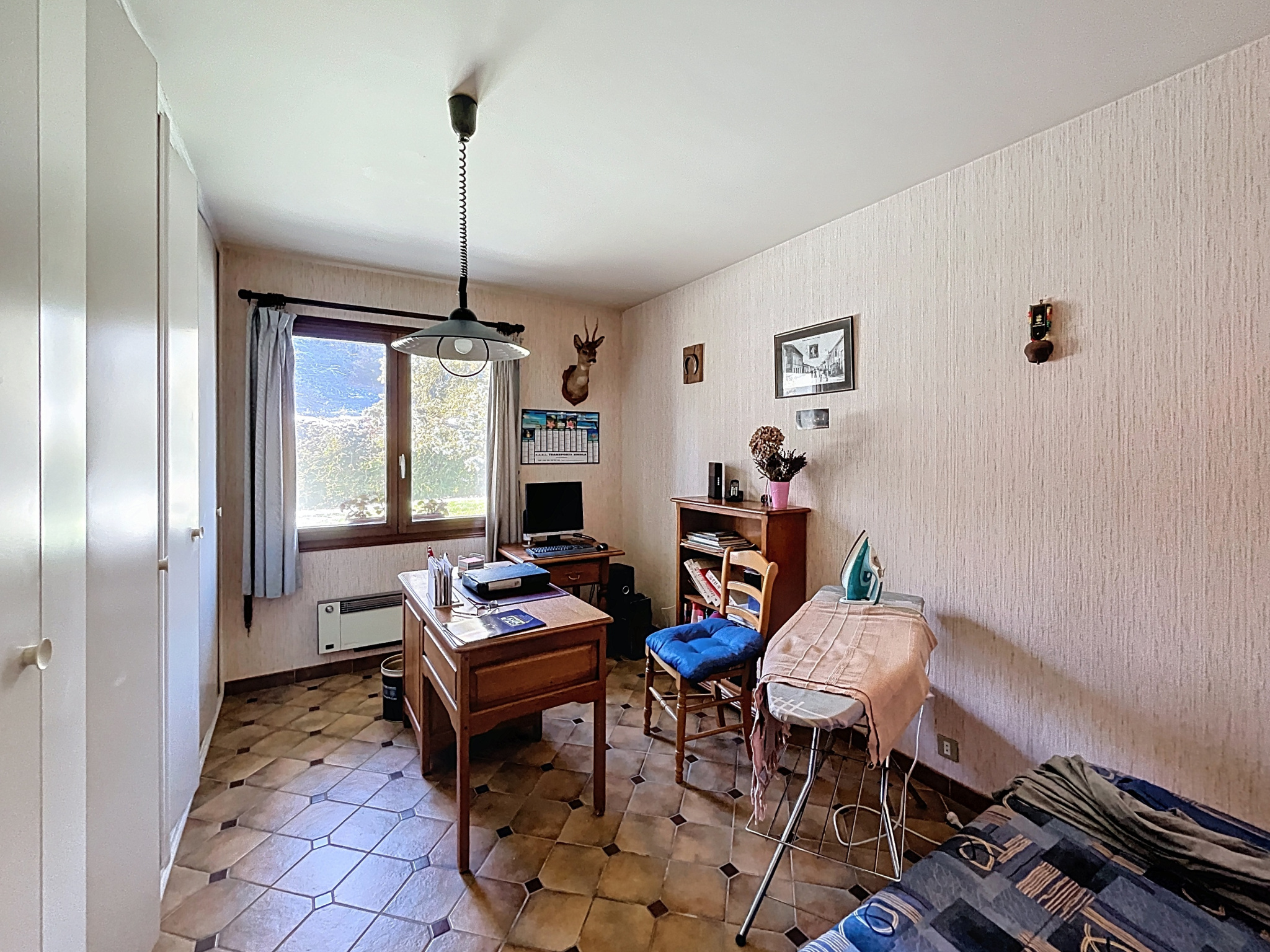 - Chambre/bureau (13,60m2) : carrelage, placards de rangement, convecteur, fenêtre ;
