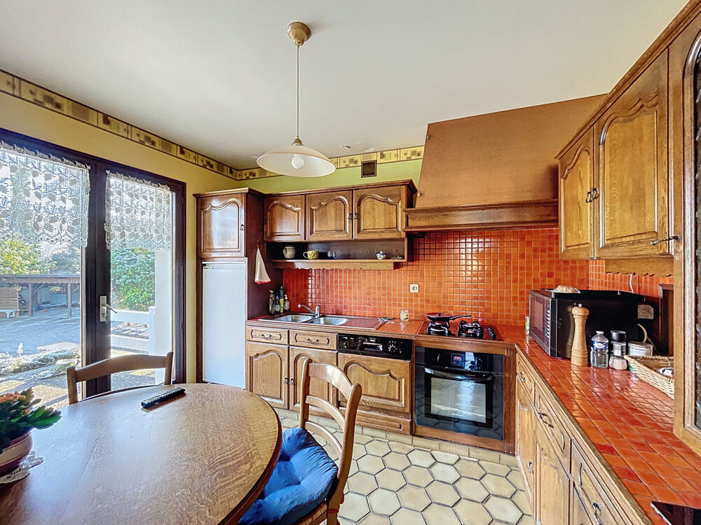 - Cuisine (10,49m2) : carrelage, cuisine chêne avec éléments de rangement haute et bas, four, plaque, lavabo double bac, convecteur, porte-fenêtre ;