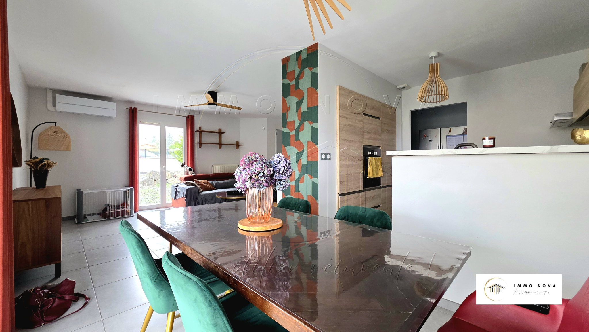 Belle pièce de vie lumineuse avec cuisine ouverte, prolongée par un cellier