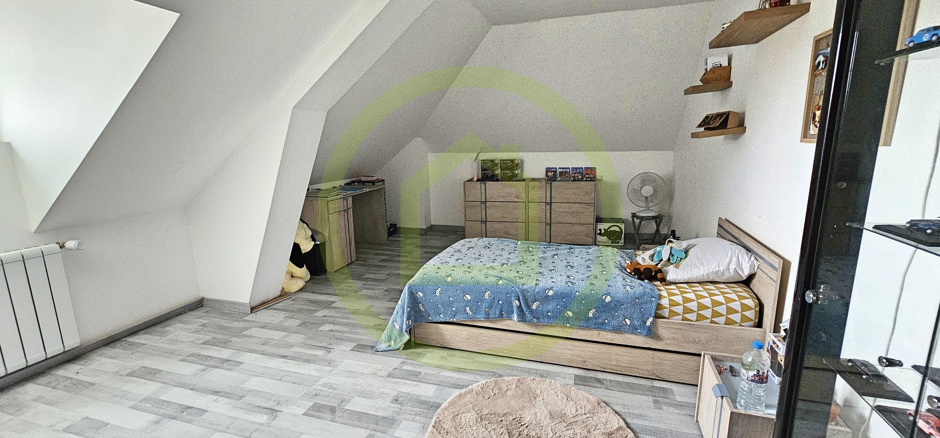 A l'étage, un grand palier dessert deux chambres ainsi qu'une pièce d'eau avec WC à finir d'aménager.